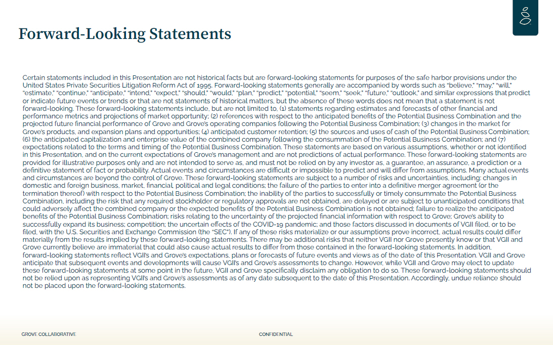 GROVE COLLABORATIVE C ONFIDENTIAL Forward - Looking Statements Certain statements included in this Presentation are not historical facts but are forward - looking statements for purposes of the safe harbor provisions under the United States Private Securities Litigation Reform Act of 1995. Forward - looking statements generally are accompanied by words such as “believe,” “may,” “will,” “estimate,” “continue,” “anticipate,” “intend,” “expect,” “should,” “would,” “plan,” “predict,” “potential,” “seem,” “seek,” “future,” “outlook,” and similar expressions that predict or indicate future events or trends or that are not statements of historical matters, but the absence of these words does not mean that a statement is not forward - looking. These forward - looking statements include, but are not limited to, (1) statements regarding estimates and forecasts of other financial and performance metrics and projections of market opportunity; (2) references with respect to the anticipated benefits of the Potential Business Combination and the projected future financial performance of Grove and Grove’s operating companies following the Potential Business Combination; (3) changes in the market for Grove’s products, and expansion plans and opportunities; (4) anticipated customer retention; (5) the sources and uses of cash of the Potential Business Combination; (6) the anticipated capitalization and enterprise value of the combined company following the consummation of the Potential Business Combination; and (7) expectations related to the terms and timing of the Potential Business Combination. These statements are based on various assumptions, whether or not identified in this Presentation, and on the current expectations of Grove’s management and are not predictions of actual performance. These forward - looking statements are provided for illustrative purposes only and are not intended to serve as, and must not be relied on by any investor as, a guarantee, an assurance, a prediction or a definitive statement of fact or probability. Actual events and circumstances are difficult or impossible to predict and will differ from assumptions. Many actual events and circumstances are beyond the control of Grove. These forward - looking statements are subject to a number of risks and uncertainties, including: changes in domestic and foreign business, market, financial, political and legal conditions; the failure of the parties to enter into a definitive merger agreement (or the termination thereof) with respect to the Potential Business Combination; the inability of the parties to successfully or timely consummate the Potential Business Combination, including the risk that any required stockholder or regulatory approvals are not obtained, are delayed or are subject to unanticipated conditions that could adversely affect the combined company or the expected benefits of the Potential Business Combination is not obtained; failure to realize the anticipated benefits of the Potential Business Combination; risks relating to the uncertainty of the projected financial information with respect to Grove; Grove’s ability to successfully expand its business; competition; the uncertain effects of the COVID - 19 pandemic; and those factors discussed in documents of VGII filed, or to be filed, with the U.S. Securities and Exchange Commission (the “SEC”). If any of these risks materialize or our assumptions prove incorrect, actual results could differ materially from the results implied by these forward - looking statements. There may be additional risks that neither VGII nor Grove presently know or that VGII and Grove currently believe are immaterial that could also cause actual results to differ from those contained in the forward - looking statements. In addition, forward - looking statements reflect VGII’s and Grove’s expectations, plans or forecasts of future events and views as of the date of this Presentation. VGII and Grove anticipate that subsequent events and developments will cause VGII’s and Grove’s assessments to change. However, while VGII and Grove may elect to update these forward - looking statements at some point in the future, VGII and Grove specifically disclaim any obligation to do so. These forward - looking statements should not be relied upon as representing VGII’s and Grove’s assessments as of any date subsequent to the date of this Presentation. Accordingly, undue reliance should not be placed upon the forward - looking statements.