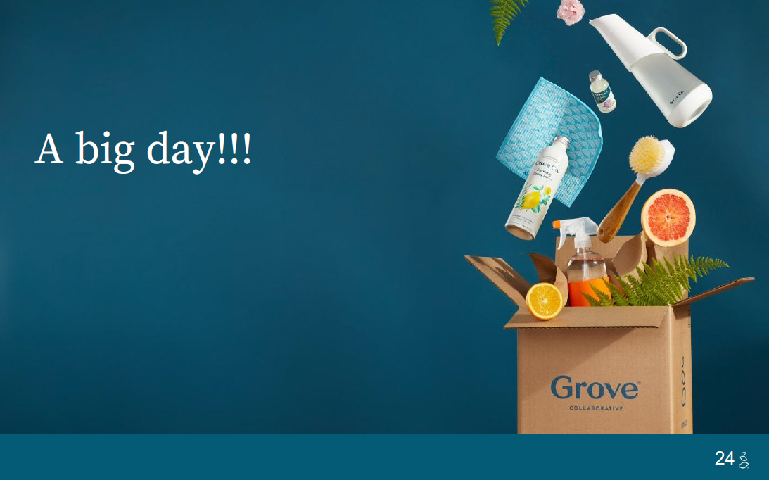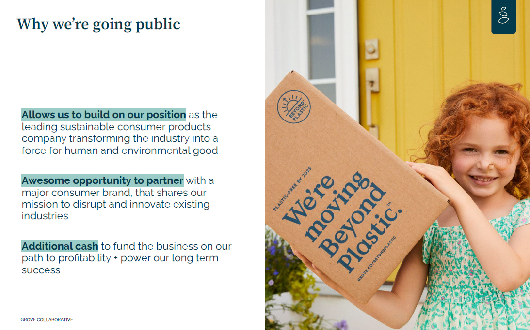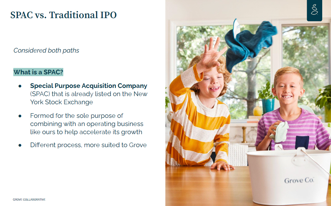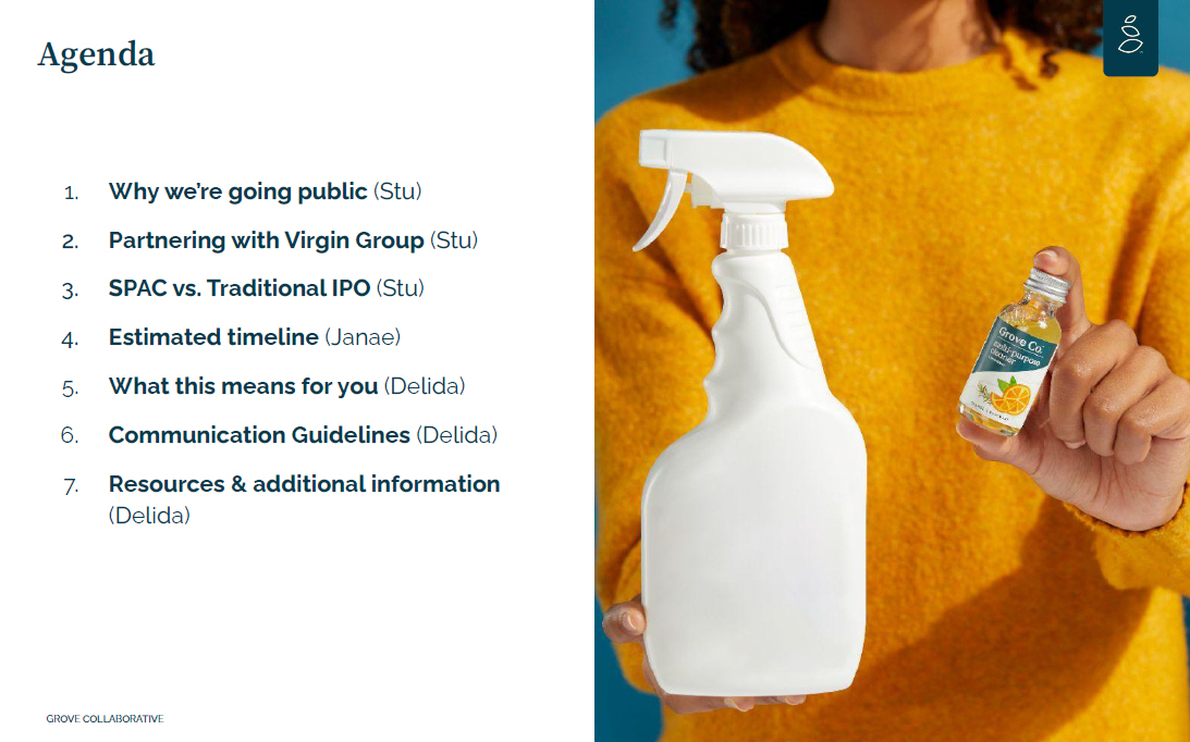 Image Here *Cover gray box A g en d a 1. Why we’re going public (Stu) 2. Partnering with Virgin Group (Stu) 3. SPAC vs. Traditional IPO (Stu) 4. Estimated timeline (Janae) 5. What this means for you (Delida) 6. Communication Guidelines (Delida) 7. Resources & additional information (Delida) GROVE COLLABORATIVE
