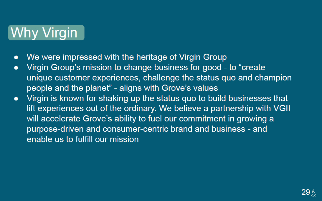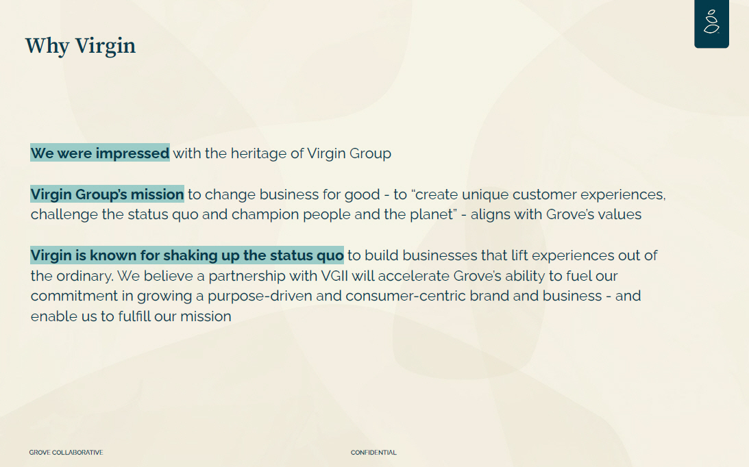 GROVE COLLABORATIVE C ONFIDENTIAL Why Virgin We were impressed with the heritage of Virgin Group Virgin Group’s mission to change business for good - to “create unique customer experiences, challenge the status quo and champion people and the planet” - aligns with Grove’s values Virgin is known for shaking up the status quo to build businesses that lift experiences out of the ordinary. We believe a partnership with VGII will accelerate Grove’s ability to fuel our commitment in growing a purpose - driven and consumer - centric brand and business - and enable us to fulfill our mission