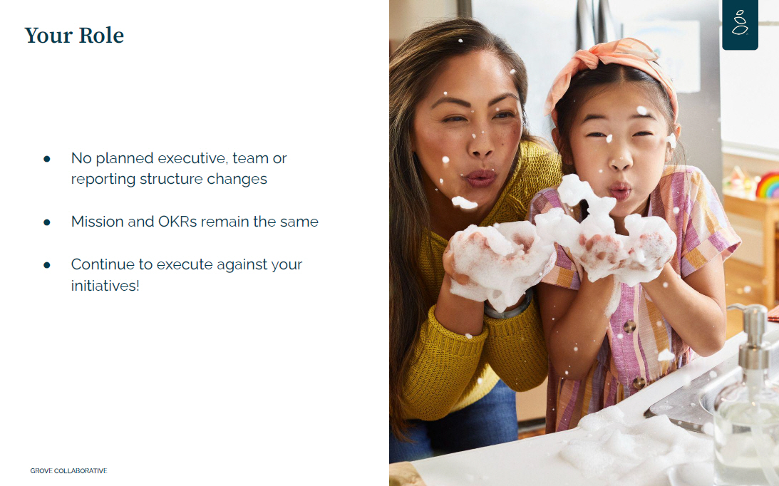 Image Here *Cover gray box Your Role ● No planned executive, team or reporting structure changes ● Mission and OKRs remain the same ● Continue to execute against your initiatives! GROVE COLLABORATIVE