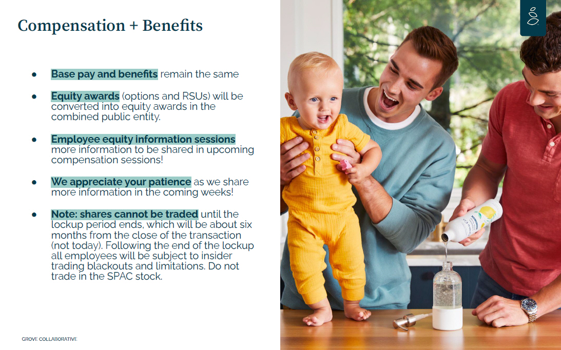 Image Here *Cover gray box Compensation + Benefits Ɣ Base pay and benefits remain the same Ɣ Equity awards (options and RSUs) will be converted into equity awards in the combined public entity. Ɣ Employee equity information sessions more information to be shared in upcoming compensation sessions! Ɣ We appreciate your patience as we share more information in the coming weeks! Ɣ Note: shares cannot be traded until the lockup period ends, which will be about six months from the close of the transaction (not today). Following the end of the lockup all employees will be subject to insider trading blackouts and limitations. Do not trade in the SPAC stock. GROVE COLLABORATIVE