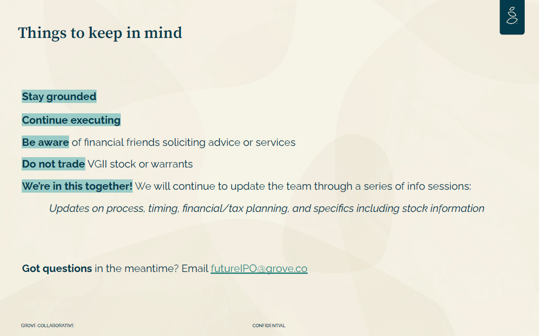 Things to keep in mind GROVE COLLABORATIVE C ONFIDENTIAL Stay grounded Continue executing Be aware of financial friends soliciting advice or services Do not trade VGII stock or warrants We’re in this together! We will continue to update the team through a series of info sessions: Updates on process, timing, financial/tax planning, and specifics including stock information Got questions in the meantime? Email futureIPO@grove.co