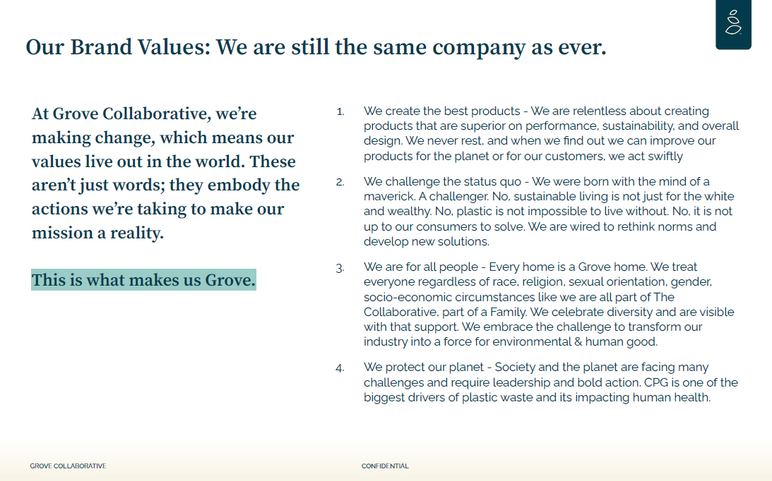 Our Brand Values: We are still the same company as ever. GROVE COLLABORATIVE C ONFIDENTIAL At Grove Collaborative, weʼre making change, which means our values live out in the world. These arenʼt just words; they embody the actions weʼre taking to make our mission a reality. This is what makes us Grove. 1. We create the best products - We are relentless about creating products that are superior on performance, sustainability, and overall design. We never rest, and when we find out we can improve our products for the planet or for our customers, we act swiftly 2. We challenge the status quo - We were born with the mind of a maverick. A challenger. No, sustainable living is not just for the white and wealthy. No, plastic is not impossible to live without. No, it is not up to our consumers to solve. We are wired to rethink norms and develop new solutions. 3. We are for all people - Every home is a Grove home. We treat everyone regardless of race, religion, sexual orientation, gender, socio - economic circumstances like we are all part of The Collaborative, part of a Family. We celebrate diversity and are visible with that support. We embrace the challenge to transform our industry into a force for environmental & human good. 4. We protect our planet - Society and the planet are facing many challenges and require leadership and bold action. CPG is one of the biggest drivers of plastic waste and its impacting human health.