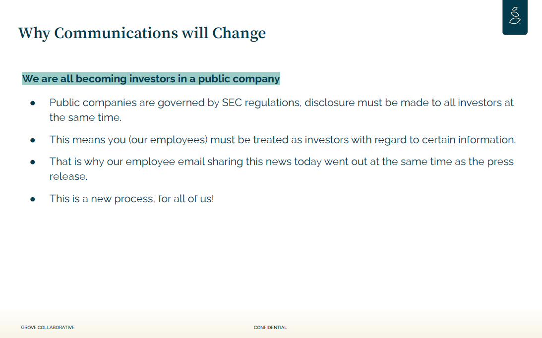 Why Communications will Change GROVE COLLABORATIVE C ONFIDENTIAL We are all becoming investors in a public company ● Public companies are governed by SEC regulations, disclosure must be made to all investors at the same time. ● This means you (our employees) must be treated as investors with regard to certain information. ● That is why our employee email sharing this news today went out at the same time as the press release. ● This is a new process, for all of us!