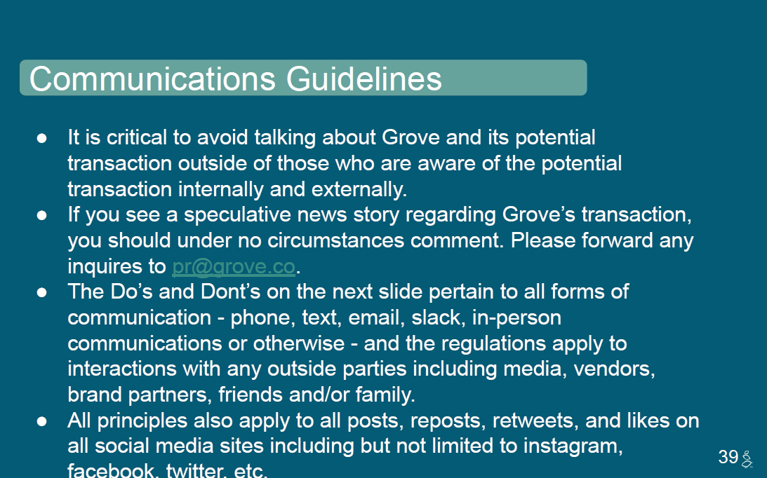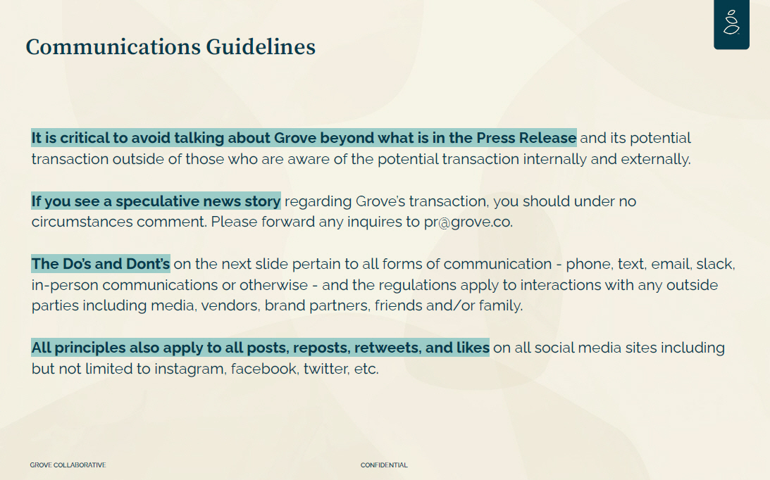 Communications Guidelines GROVE COLLABORATIVE C ONFIDENTIAL It is critical to avoid talking about Grove beyond what is in the Press Release and its potential transaction outside of those who are aware of the potential transaction internally and externally. If you see a speculative news story regarding Grove’s transaction, you should under no circumstances comment. Please forward any inquires t o pr@grove.co. The Do’s and Dont’s on the next slide pertain to all forms of communication - phone, text, email, slack, in - person communications or otherwise - and the regulations apply to interactions with any outside parties including media, vendors, brand partners, friends and/or family. All principles also apply to all posts, reposts, retweets, and likes on all social media sites including but not limited to instagram, facebook, twitter, etc.