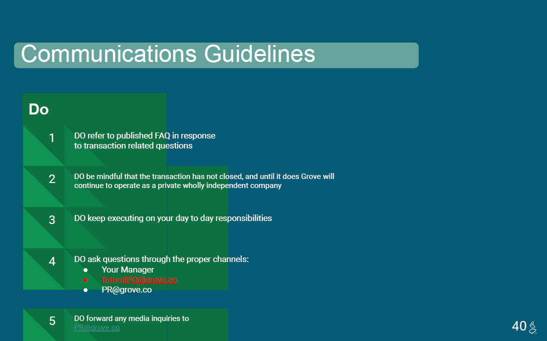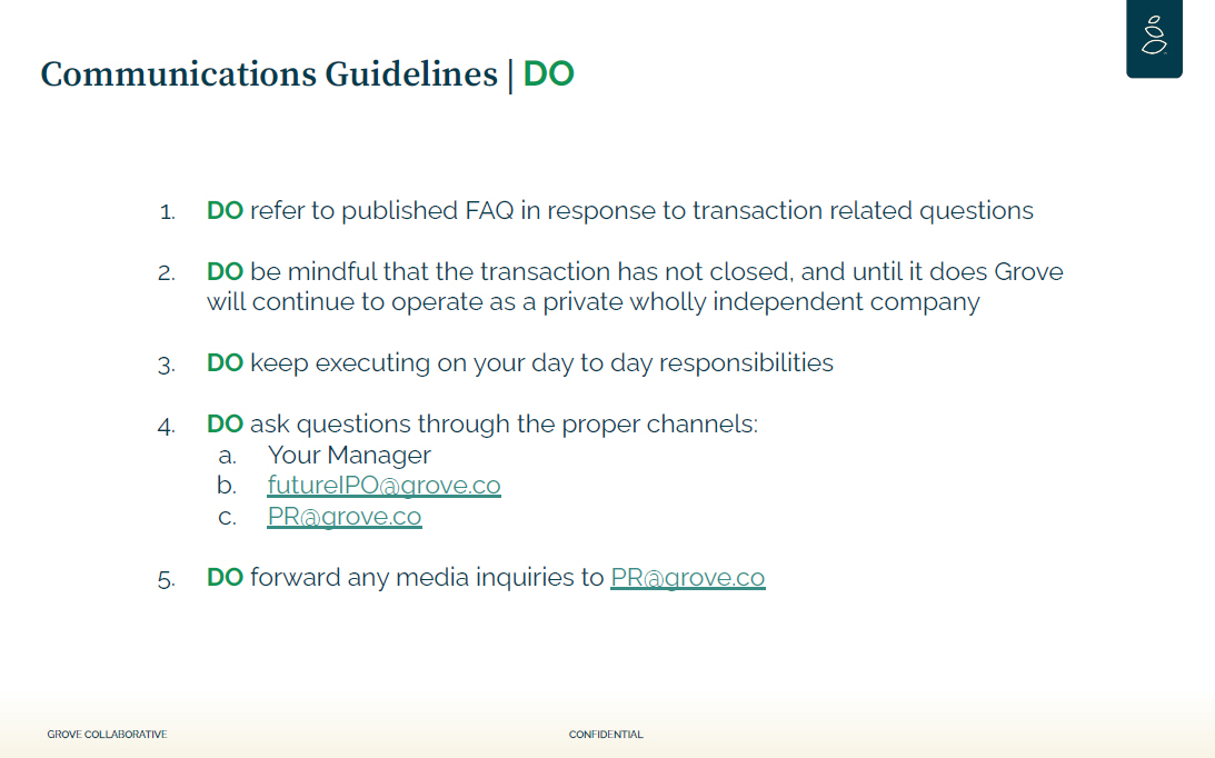Communications Guidelines | DO GROVE COLLABORATIVE C ONFIDENTIAL 1. DO refer to published FAQ in response to transaction related questions 2. DO be mindful that the transaction has not closed, and until it does Grove will continue to operate as a private wholly independent company 3. DO keep executing on your day to day responsibilities 4. DO ask questions through the proper channels: a. Your Manager b. futureIPO@grove.co c. PR@grove.co 5. DO forward any media inquiries to PR@grove.co