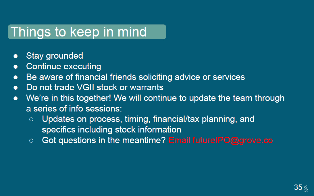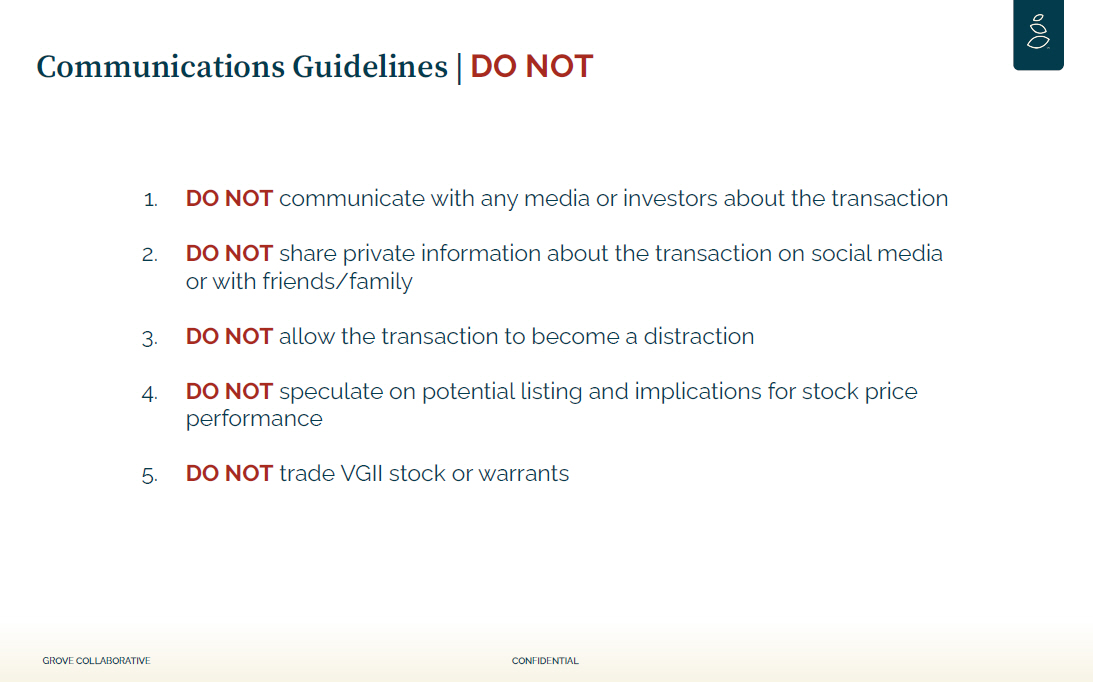 Communications Guidelines | DO NOT GROVE COLLABORATIVE C ONFIDENTIAL 1. DO NOT communicate with any media or investors about the transaction 2. DO NOT share private information about the transaction on social media or with friends/family 3. DO NOT allow the transaction to become a distraction 4. DO NOT speculate on potential listing and implications for stock price performance 5. DO NOT trade VGII stock or warrants