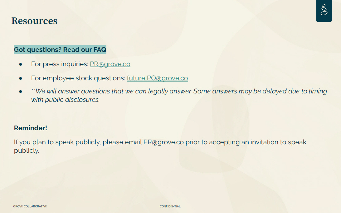 R es o u r c es GROVE COLLABORATIVE C ONFIDENTIAL Got questions? Read our FAQ ● For press inquiries: PR@grove.co ● For employee stock questions: futureIPO@grove.co ● **We will answer questions that we can legally answer. Some answers may be delayed due to timing with public disclosures. Reminder! If you plan to speak publicly, please email PR@grove.co prior to accepting an invitation to speak publicly.