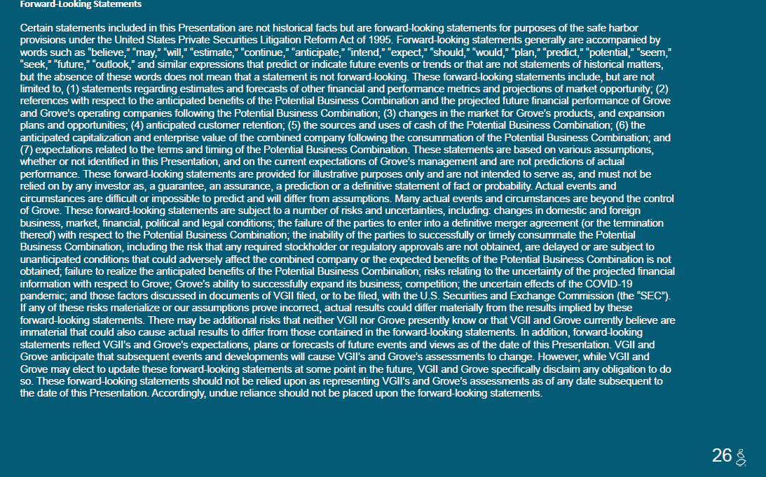 Forward - Looking Statements Certain statements included in this Presentation are not historical facts but are forward - looking statements for purposes of the safe harbor provisions under the United States Private Securities Litigation Reform Act of 1995. Forward - looking statements generally are accompanied by words such as “believe,” “may,” “will,” “estimate,” “continue,” “anticipate,” “intend,” “expect,” “should,” “would,” “plan,” “predict,” “potential,” “seem,” “seek,” “future,” “outlook,” and similar expressions that predict or indicate future events or trends or that are not statements of historical matters, but the absence of these words does not mean that a statement is not forward - looking. These forward - looking statements include, but are not limited to, (1) statements regarding estimates and forecasts of other financial and performance metrics and projections of market opportunity; (2) references with respect to the anticipated benefits of the Potential Business Combination and the projected future financial performance of Grove and Grove’s operating companies following the Potential Business Combination; (3) changes in the market for Grove’s products, and expansion plans and opportunities; (4) anticipated customer retention; (5) the sources and uses of cash of the Potential Business Combination; (6) the anticipated capitalization and enterprise value of the combined company following the consummation of the Potential Business Combination; and (7) expectations related to the terms and timing of the Potential Business Combination. These statements are based on various assumptions, whether or not identified in this Presentation, and on the current expectations of Grove’s management and are not predictions of actual performance. These forward - looking statements are provided for illustrative purposes only and are not intended to serve as, and must not be relied on by any investor as, a guarantee, an assurance, a prediction or a definitive statement of fact or probability. Actual events and circumstances are difficult or impossible to predict and will differ from assumptions. Many actual events and circumstances are beyond the control of Grove. These forward - looking statements are subject to a number of risks and uncertainties, including: changes in domestic and foreign business, market, financial, political and legal conditions; the failure of the parties to enter into a definitive merger agreement (or the termination thereof) with respect to the Potential Business Combination; the inability of the parties to successfully or timely consummate the Potential Business Combination, including the risk that any required stockholder or regulatory approvals are not obtained, are delayed or are subject to unanticipated conditions that could adversely affect the combined company or the expected benefits of the Potential Business Combination is not obtained; failure to realize the anticipated benefits of the Potential Business Combination; risks relating to the uncertainty of the projected financial information with respect to Grove; Grove’s ability to successfully expand its business; competition; the uncertain effects of the COVID - 19 pandemic; and those factors discussed in documents of VGII filed, or to be filed, with the U.S. Securities and Exchange Commission (the “SEC”). If any of these risks materialize or our assumptions prove incorrect, actual results could differ materially from the results implied by these forward - looking statements. There may be additional risks that neither VGII nor Grove presently know or that VGII and Grove currently believe are immaterial that could also cause actual results to differ from those contained in the forward - looking statements. In addition, forward - looking statements reflect VGII’s and Grove’s expectations, plans or forecasts of future events and views as of the date of this Presentation. VGII and Grove anticipate that subsequent events and developments will cause VGII’s and Grove’s assessments to change. However, while VGII and Grove may elect to update these forward - looking statements at some point in the future, VGII and Grove specifically disclaim any obligation to do so. These forward - looking statements should not be relied upon as representing VGII’s and Grove’s assessments as of any date subsequent to the date of this Presentation. Accordingly, undue reliance should not be placed upon the forward - looking statements. 26