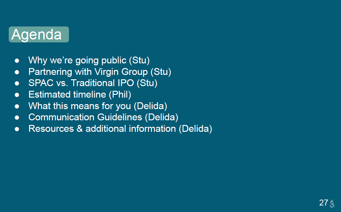 Agenda 27 ● Why we’re going public (Stu) ● Partnering with Virgin Group (Stu) ● SPAC vs. Traditional IPO (Stu) ● Estimated timeline (Phil) ● What this means for you (Delida) ● Communication Guidelines (Delida) ● Resources & additional information (Delida)