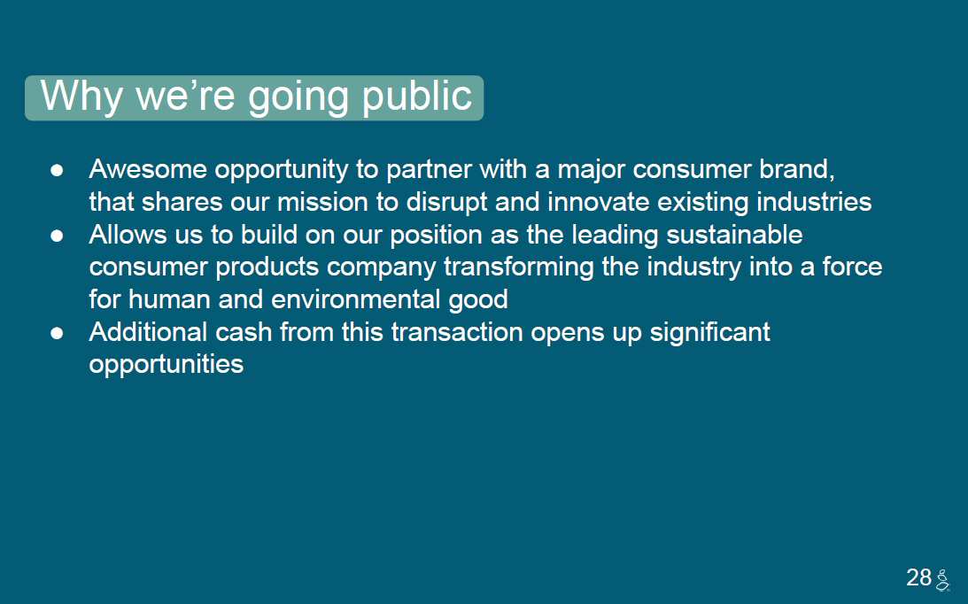 Why we’re going public 28 ● Awesome opportunity to partner with a major consumer brand, that shares our mission to disrupt and innovate existing industries ● Allows us to build on our position as the leading sustainable consumer products company transforming the industry into a force for human and environmental good ● Additional cash from this transaction opens up significant opportunities