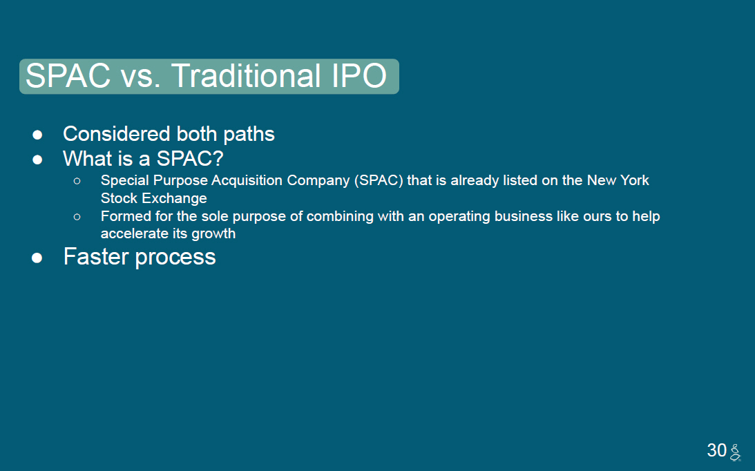 SPAC vs. Traditional IPO 30 ● Considered both paths ● What is a SPAC? ○ Special Purpose Acquisition Company (SPAC) that is already listed on the New York Stock Exchange ○ Formed for the sole purpose of combining with an operating business like ours to help accelerate its growth ● Faster process