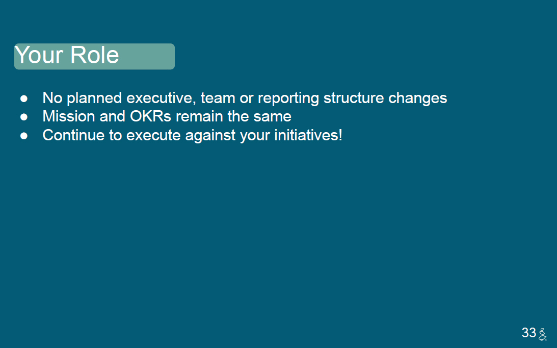 Your Role 33 ● No planned executive, team or reporting structure changes ● Mission and OKRs remain the same ● Continue to execute against your initiatives!