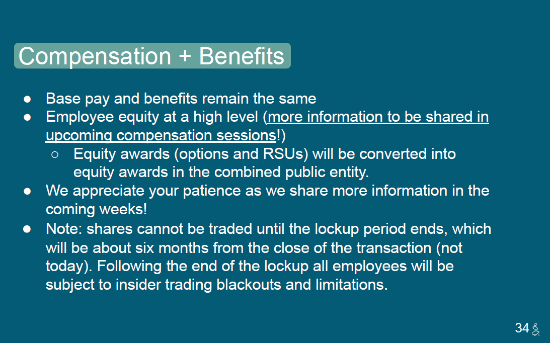 Compensation + Benefits 34 ● Base pay and benefits remain the same ● Employee equity at a high level ( more information to be shared in upcoming compensation sessions !) ○ Equity awards (options and RSUs) will be converted into equity awards in the combined public entity. ● We appreciate your patience as we share more information in the coming weeks! ● Note: shares cannot be traded until the lockup period ends, which will be about six months from the close of the transaction (not today). Following the end of the lockup all employees will be subject to insider trading blackouts and limitations.