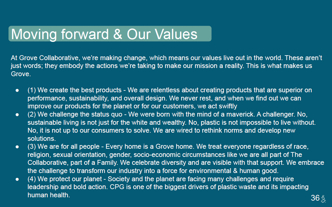 36 Moving forward & Our Values At Grove Collaborative, we’re making change, which means our values live out in the world. These aren’t just words; they embody the actions we’re taking to make our mission a reality. This is what makes us Grove. ● (1) We create the best products - We are relentless about creating products that are superior on performance, sustainability, and overall design. We never rest, and when we find out we can improve our products for the planet or for our customers, we act swiftly ● (2) We challenge the status quo - We were born with the mind of a maverick. A challenger. No, sustainable living is not just for the white and wealthy. No, plastic is not impossible to live without. No, it is not up to our consumers to solve. We are wired to rethink norms and develop new solutions. ● (3) We are for all people - Every home is a Grove home. We treat everyone regardless of race, religion, sexual orientation, gender, socio - economic circumstances like we are all part of The Collaborative, part of a Family. We celebrate diversity and are visible with that support. We embrace the challenge to transform our industry into a force for environmental & human good. ● (4) We protect our planet - Society and the planet are facing many challenges and require leadership and bold action. CPG is one of the biggest drivers of plastic waste and its impacting human health.