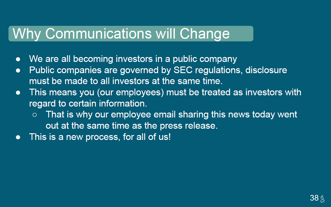 Why Communications will Change 38 ● We are all becoming investors in a public company ● Public companies are governed by SEC regulations, disclosure must be made to all investors at the same time. ● This means you (our employees) must be treated as investors with regard to certain information. ○ That is why our employee email sharing this news today went out at the same time as the press release. ● This is a new process, for all of us!