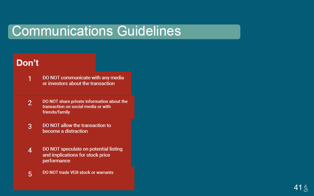 Communications Guidelines 2 Lorem ipsum dolor sit amet nec at adipiscing 3 DO NOT allow the transaction to become a distraction DO NOT speculate on potential listing and implications for stock price performance 4 Don’t 1 DO NOT communicate with any media or investors about the transaction 2 DO NOT share private information about the transaction on social media or with friends/family 5 DO NOT trade VGII stock or warrants 41