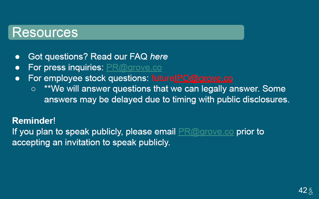 Resources 42 ● Got questions? Read our FAQ here ● For press inquiries: PR@grove.co ● For employee stock questions: future IPO@grove.co ○ **We will answer questions that we can legally answer. Some answers may be delayed due to timing with public disclosures. Reminder ! If you plan to speak publicly, please email PR@grove.co prior to accepting an invitation to speak publicly.