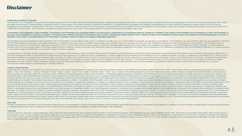 NOTES START FROM HERE AND GROW UP CONTENT BELOW THIS LINE CONTENT BELOW THIS LINE SUBTITLE BELOW THIS LINE TITLE CAN NOT GO ABOVE THIS LINE 2 2 Confidentiality and Basis of Presentation This Presentation (this “Presentation”) is provided for informational purposes only and has been prepared to assist intereste d p arties in making their own evaluation with respect to a potential business combination between Grove Collaborative, Inc. (“Gr ove ”) and Virgin Group Acquisition Corp. II (“VG”) and related transactions (the “Potential Business Combination”) and for no other purpose. By accepting, reviewing or reading thi s Presentation, you will be deemed to have agreed to the obligations and restrictions set out below. Without the express prio r w ritten consent of VG and Grove, this Presentation and any information contained within it may not be (i) reproduced (in whole or in part), (ii) copied at any time , ( iii) used for any purpose other than your evaluation of Grove or (iv) provided to any other person, except your employees and ad visors with a need to know who are advised of the confidentiality of the information. This Presentation supersedes and replaces all previous oral or written communications be twe en the parties hereto relating to the subject matter hereof. The information in this Presentation is highly confidential. The distribution of this Presentation by an authorized recipient to any other person is unauthorized. Any photocopying, disclosure, reproduction or alteration of the contents of this Presentati on and any forwarding of a copy of this Presentation or any portion of this Presentation to any person is prohibited. The recipient of this Presentation shall keep this Presentation an d its contents confidential and shall be required to return or destroy all copies of this Presentation or portions thereof in it s possession promptly following request for the return or destruction of such copies. By accepting delivery of this Presentation, the recipient is deemed to agree to the foregoing co nfi dentiality requirements. This Presentation and any oral statements made in connection with this Presentation do not constitute an offer to sell, or a sol icitation of an offer to buy, or a recommendation to purchase, any securities in any jurisdiction, or the solicitation of any vo te, consent or approval in any jurisdiction in connection with the Potential Business Combination or any related transactions, nor shall there be any sale, issuance or transfer of any se curities in any jurisdiction where, or to any person to whom, such offer, solicitation or sale may be unlawful under the laws of such jurisdiction. This Presentation does not constitute either advice or a recommendation regarding any securities. Any offer to sell securities will be made only pursuan t t o a definitive Subscription Agreement and will be made in reliance on an exemption from registration under the Securities Act of 1933, as amended, for offers and sales of securities that do not involve a public offering. VG and Grove reserve the right to withdraw or amend for any reason any offe rin g and to reject any Subscription Agreement for any reason. The communication of this Presentation is restricted by law; it is no t intended for distribution to, or use by any person in, any jurisdiction where such distribution or use would be contrary to local law or regulation. No representations or warranties, express or implied are given in, or in respect of, this Presentation. Industry and market d ata used in this Presentation have been obtained from third - party industry publications and sources as well as from research report s prepared for other purposes. Neither VG nor Grove has independently verified the data obtained from these sources and cannot assure you of the data’s accuracy or complet ene ss. This data is subject to change. Recipients of this Presentation are not to construe its contents, or any prior or subsequ ent communications from or with VG, Grove or their respective affiliates or representatives as investment, legal or tax advice. In addition, this Presentation does not pu rpo rt to be all - inclusive or to contain all of the information that may be required to make a full analysis of Grove or the Potenti al Business Combination. Recipients of this Presentation should each make their own evaluation of Grove and of the relevance and adequacy of the information and should make such othe r i nvestigations as they deem necessary. To the fullest extent permitted by law, in no circumstances will VG, Grove or any of th eir respective stockholders, affiliates, representatives, partners, directors, officers, employees, advisers or agents be responsible or liable for any direct, indire ct, or consequential loss or loss of profit arising from the use of this presentation, its contents, its omissions, reliance on t he information contained within it or on opinions communicated in relation thereto or otherwise arising in connection therewith. Forward - Looking Statements Certain statements included in this Presentation are not historical facts but are forward - looking statements for purposes of the safe harbor provisions under the United States Private Securities Litigation Reform Act of 1995. Forward - looking statements gen erally are accompanied by words such as “believe,” “may,” “will,” “estimate,” “continue,” “anticipate,” “intend,” “expect,” “should,” “would,” “plan,” “predict,” “po ten tial,” “seem,” “seek,” “future,” “outlook,” and similar expressions that predict or indicate future events or trends or that are not statements of historical matters, but the absence of these words does not mean that a statement is not forward - looking. These forward - looking statements include, but are not limited to, (1) statements regarding estimates and forecasts of other financial and performance metrics and projections of market opp o