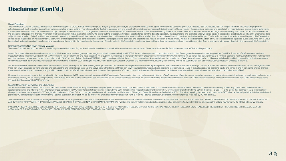 NOTES START FROM HERE AND GROW UP CONTENT BELOW THIS LINE CONTENT BELOW THIS LINE SUBTITLE BELOW THIS LINE TITLE CAN NOT GO ABOVE THIS LINE 3 3 Use of Projections This Presentation contains projected financial information with respect to Grove, namely revenue and gross margin, gross prod uct margin, Grove brands revenue share, gross revenue share by brand, gross profit, adjusted EBITDA, adjusted EBITDA margin, fulf il lment cost, operating expenses, advertising spend. Such projected financial information constitutes forward - looking information, and is for illustrative purpose s only and should not be relied upon as necessarily being indicative of future results. The projections, estimates and targe ts in this Presentation are forward - looking statements that are based on assumptions that are inherently subject to significant uncertainties and contingencies, many of which are b eyo nd VG’s and Grove’s control. See “Forward - Looking Statements” above. While all projections, estimates and targets are necessaril y speculative, VG and Grove believe that the preparation of prospective financial information involves increasingly higher levels of uncertainty the further out the p roj ection, estimate or target extends from the date of preparation. The assumptions and estimates underlying the projected, expe cte d or target results are inherently uncertain and are subject to a wide variety of significant business, economic, regulatory, competitive and other risks and uncertainties that c oul d cause actual results to differ materially from those contained in such projections, estimates and targets. The inclusion of pr ojections, estimates and targets in this Presentation should not be regarded as an indication that VG and Grove, or their representatives, considered or consider the financial pro jec tions, estimates and targets to be a reliable prediction of future events. Neither the independent auditors of VG nor the in dep endent registered public accounting firm of Grove has audited, reviewed, compiled or performed any procedures with respect to the projections for the purpose of their inclusio n i n this Presentation, and accordingly, neither of them expressed an opinion or provided any other form of assurance with respe ct thereto for the purpose of this Presentation. Financial Information; Non - GAAP Financial Measures The Grove financial information and data for the fiscal years ended December 31, 2019 and 2020 included herein are audited in ac cordance with Association of International Certified Professional Accountants (AICPA) auditing standards. Some of the financial information and data contained in this Presentation, such as gross product margin, contribution profit and adjusted EBITDA, have not been prepared in accordance with United States generally accepted accounting principles (“GAAP”). T he se non - GAAP measures, and other measures that are calculated using such non - GAAP measures, are an addition to, and not a substitute for or superior to, measures of financial performance prepared in accordance with GAAP and should not be considered as an alternative to revenue, operatin g income, profit before tax, net income or any other performance measures derived in accordance with GAAP. A reconciliation of adjusted EBITDA to Net Income is provided at the end of this presentation. A reconciliation of the projected non - GAAP financial measures has not been provided and is unable to be provided without unreaso nable effort because certain items excluded from these non - GAAP financial measures such as charges related to stock - based compensation expenses and related tax effects, including non - recurring income tax adjustments, cannot be reasonably calculated or predicted at this time. VG and Grove believe these non - GAAP measures of financial results, including on a forward - looking basis, provide useful informat ion to management and investors regarding certain financial and business trends relating to Grove’s financial condition and r esu lts of operations. Grove’s management uses these non - GAAP measures for trend analyses and for budgeting and planning purposes. VG and Grove believe that the use of these n on - GAAP financial measures provides an additional tool for investors to use in evaluating projected operating results and trends in and in comparing Grove’s financial measures with other similar companies, many of which present similar non - GAAP financial measures to investors. Management of VG does not consider these non - GAAP measures in isolation or as an alternative to financial measures determined in accordance with GAAP. However, there are a number of limitations related to the use of these non - GAAP measures and their nearest GAAP equivalents. For example, other companies may calculate non - GAAP measures differently, or may use other measures to calculate their financial pe rformance, and therefore Grove’s non - GAAP measures may not be directly comparable to similarly titled measures of other companies. See the footnotes on the slides wh ere these measures are discussed and the Appendix for definitions of these non - GAAP financial measures and reconciliations of th ese non - GAAP financial measures to the most directly comparable GAAP measures. Important Information for Investors and Stockholders VG and Grove and their respective directors and executive officers, under SEC rules, may be deemed to be participants in the sol icitation of proxies of VG’s shareholders in connection with the Potential Business Combination. Investors and security holde rs may obtain more detailed information regarding the names and interests in the Potential Business Combination of VG’s directors and officers in VG’s filings with t he SEC, including VG’s registration statement on Form S - 1, which was originally filed with the SEC on [February 12, 2021] . To the extent that holdings of VG’s securities have changed from the amounts reported in VG’s 
