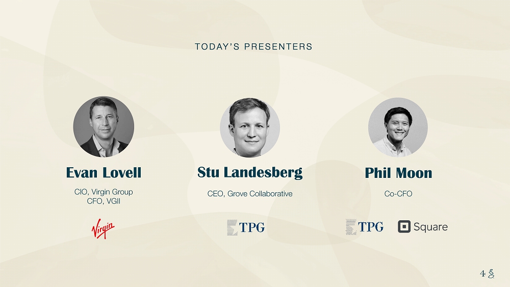 NOTES START FROM HERE AND GROW UP CONTENT BELOW THIS LINE CONTENT BELOW THIS LINE SUBTITLE BELOW THIS LINE TITLE CAN NOT GO ABOVE THIS LINE 4 4 CEO, Grove Collaborative Stu Landesberg CIO, Virgin Group CFO, VGII Evan Lovell TODAY’S PRESENTERS Co - CFO Phil Moon