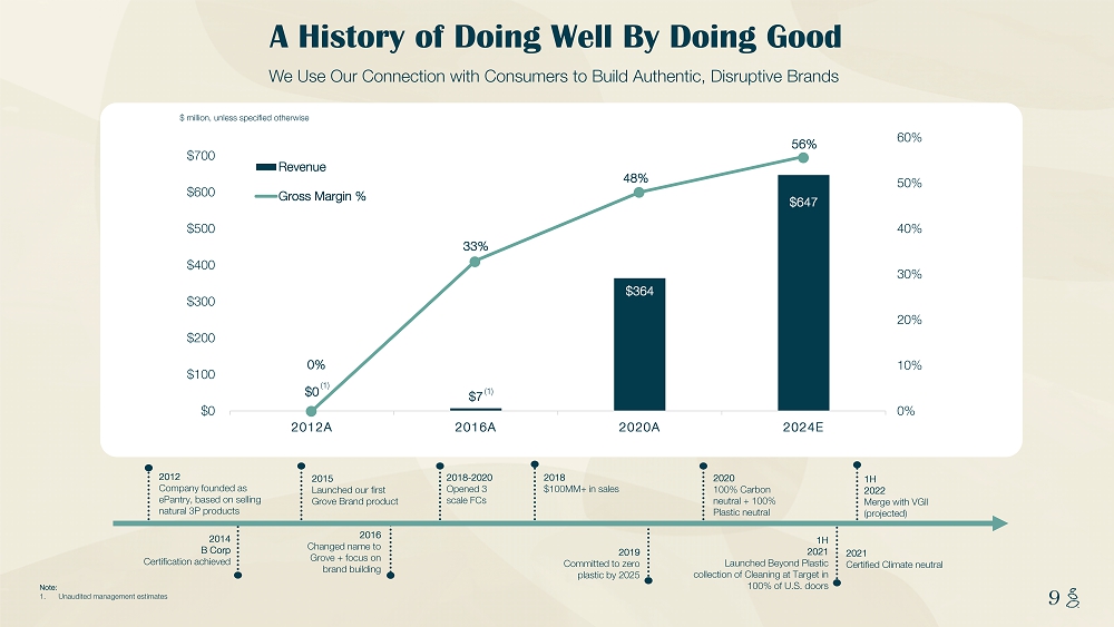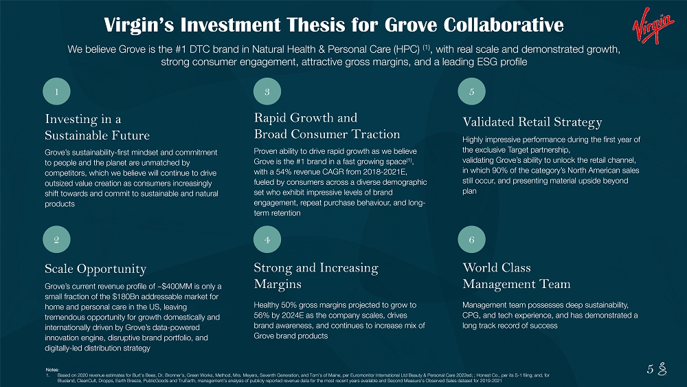 NOTES START FROM HERE AND GROW UP CONTENT BELOW THIS LINE CONTENT BELOW THIS LINE SUBTITLE BELOW THIS LINE TITLE CAN NOT GO ABOVE THIS LINE 5 5 6 World Class Management Team Management team possesses deep sustainability, CPG, and tech experience, and has demonstrated a long track record of success 4 Strong and Increasing Margins Healthy 50% gross margins projected to grow to 56% by 2024E as the company scales, drives brand awareness, and continues to increase mix of Grove brand products 2 Scale Opportunity Grove’s current revenue profile of ~$400MM is only a small fraction of the $180Bn addressable market for home and personal care in the US, leaving tremendous opportunity for growth domestically and internationally driven by Grove’s data - powered innovation engine, disruptive brand portfolio, and digitally - led distribution strategy 1 Investing in a Sustainable Future Grove’s sustainability - first mindset and commitment to people and the planet are unmatched by competitors, which we believe will continue to drive outsized value creation as consumers increasingly shift towards and commit to sustainable and natural products 3 Rapid Growth and Broad Consumer Traction Proven ability to drive rapid growth as we believe Grove is the #1 brand in a fast growing space (1) , with a 54% revenue CAGR from 2018 - 2021E, fueled by consumers across a diverse demographic set who exhibit impressive levels of brand engagement, repeat purchase behaviour, and long - term retention 5 Validated Retail Strategy Highly impressive performance during the first year of the exclusive Target partnership, validating Grove’s ability to unlock the retail channel, in which 90% of the category’s North American sales still occur, and presenting material upside beyond plan Virgin’s Investment Thesis for Grove Collaborative We believe Grove is the #1 DTC brand in Natural Health & Personal Care (HPC) (1) , with real scale and demonstrated growth, strong consumer engagement, attractive gross margins, and a leading ESG profile Notes: 1. Based on 2020 revenue estimates for Burt’s Bees, Dr. Bronner’s, Green Works, Method, Mrs. Meyers, Seventh Generation, and Tom ’s of Maine, per Euromonitor International Ltd Beauty & Personal Care 2022ed; ; Honest Co., per its S - 1 filing; and, for Blueland , CleanCult , Dropps , Earth Breeze, PublicGoods and TruEarth , management’s analysis of publicly reported revenue data for the most recent years available and Second Measure’s Observed S ale s dataset for 2019 - 2021