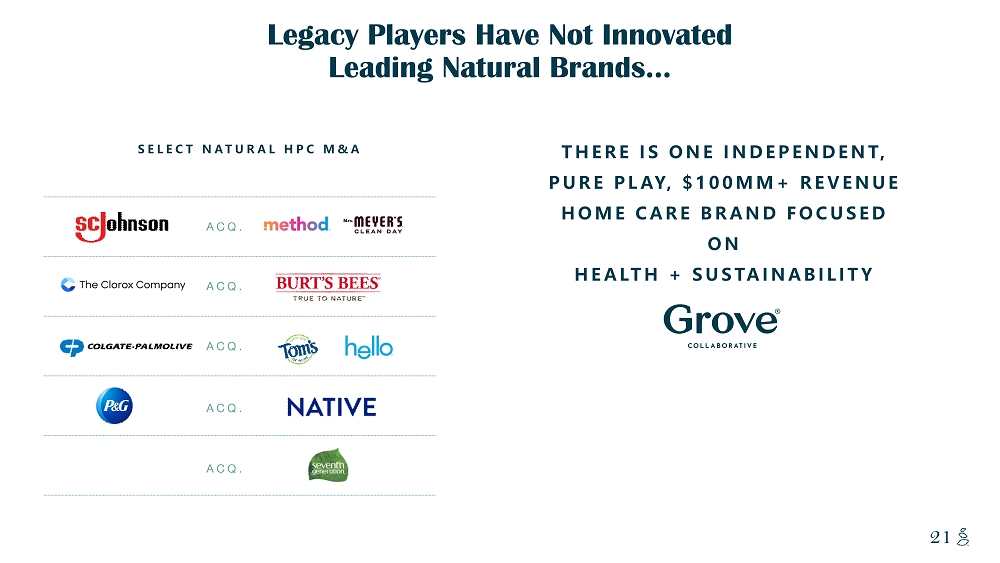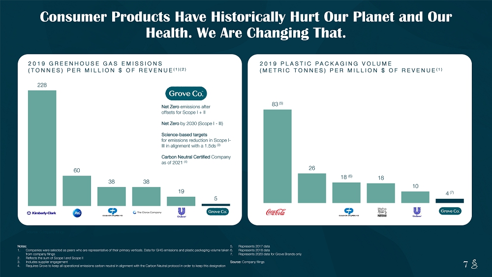 NOTES START FROM HERE AND GROW UP CONTENT BELOW THIS LINE CONTENT BELOW THIS LINE SUBTITLE BELOW THIS LINE TITLE CAN NOT GO ABOVE THIS LINE 7 7 228 60 38 38 19 5 Consumer Products Have Historically Hurt Our Planet and Our Health. We Are Changing That. 83 (5) 26 18 (6) 18 10 4 (7) Source: Company filings Net Zero emissions after offsets for Scope I + II Net Zero by 2030 (Scope I - III) Science - based targets for emissions reduction in Scope I - III in alignment with a 1.5ds (3) Carbon Neutral Certified Company as of 2021 (4) 2019 GREENHOUSE GAS EMISSIONS (TONNES) PER MILLION $ OF REVENUE (1)(2) Notes: 1. Companies were selected as peers who are representative of their primary verticals. Data for GHG emissions and plastic packag ing volume taken from company filings 2. Reflects the sum of Scope I and Scope II 3. Includes supplier engagement 4. Requires Grove to keep all operational emissions carbon neutral in alignment with the Carbon Neutral protocol in order to kee p t his designation 5. Represents 2017 data 6. Represents 2018 data 7. Represents 2020 data for Grove Brands only Source: Company filings 2019 PLASTIC PACKAGING VOLUME (METRIC TONNES) PER MILLION $ OF REVENUE (1)