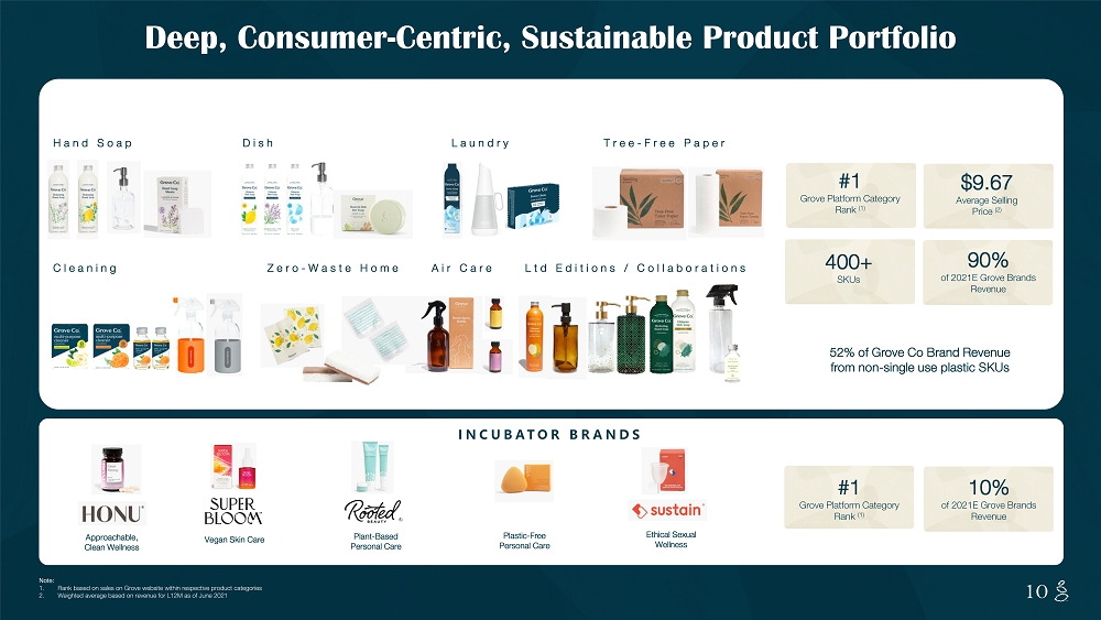 NOTES START FROM HERE AND GROW UP CONTENT BELOW THIS LINE CONTENT BELOW THIS LINE SUBTITLE BELOW THIS LINE TITLE CAN NOT GO ABOVE THIS LINE 9 9 A History of Doing Well By Doing Good $ million, unless specified otherwise $0 $7 $364 $647 0% 33% 48% 56% 0% 10% 20% 30% 40% 50% 60% $0 $100 $200 $300 $400 $500 $600 $700 2012A 2016A 2020A 2024E Revenue Gross Margin % 2016 Changed name to Grove + focus on brand building 2019 Committed to zero plastic by 2025 1H 2021 Launched Beyond Plastic collection of Cleaning at Target in 100% of U.S. doors 2012 Company founded as ePantry , based on selling natural 3P products 2014 B Corp Certification achieved 2015 Launched our first Grove Brand product 2018 - 2020 Opened 3 scale FCs 2020 100% Carbon neutral + 100% Plastic neutral 1H 2022 Merge with VGII (projected) 2018 $100MM+ in sales 2021 Certified Climate neutral We Use Our Connection with Consumers to Build Authentic, Disruptive Brands (1) (1) Note: 1. Unaudited management estimates