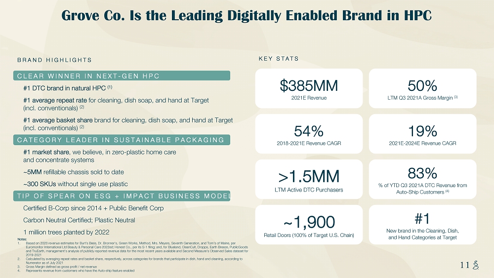 NOTES START FROM HERE AND GROW UP CONTENT BELOW THIS LINE CONTENT BELOW THIS LINE SUBTITLE BELOW THIS LINE TITLE CAN NOT GO ABOVE THIS LINE 10 10 Deep, Consumer - Centric, Sustainable Product Portfolio INCUBATOR BRANDS Approachable, Clean Wellness Plastic - Free Personal Care Ethical Sexual Wellness Plant - Based Personal Care Vegan Skin Care Note: 1. Rank based on sales on Grove website within respective product categories 2. Weighted average based on revenue for L12M as of June 2021 Hand Soap Dish Laundry Zero - Waste Home Cleaning Tree - Free Paper Air Care Ltd Editions / Collaborations #1 Grove Platform Category Rank (1) 10% of 2021E Grove Brands Revenue #1 Grove Platform Category Rank (1) 400+ SKUs $9.67 Average Selling Price (2) 90% of 2021E Grove Brands Revenue 52% of Grove Co Brand Revenue from non - single use plastic SKUs