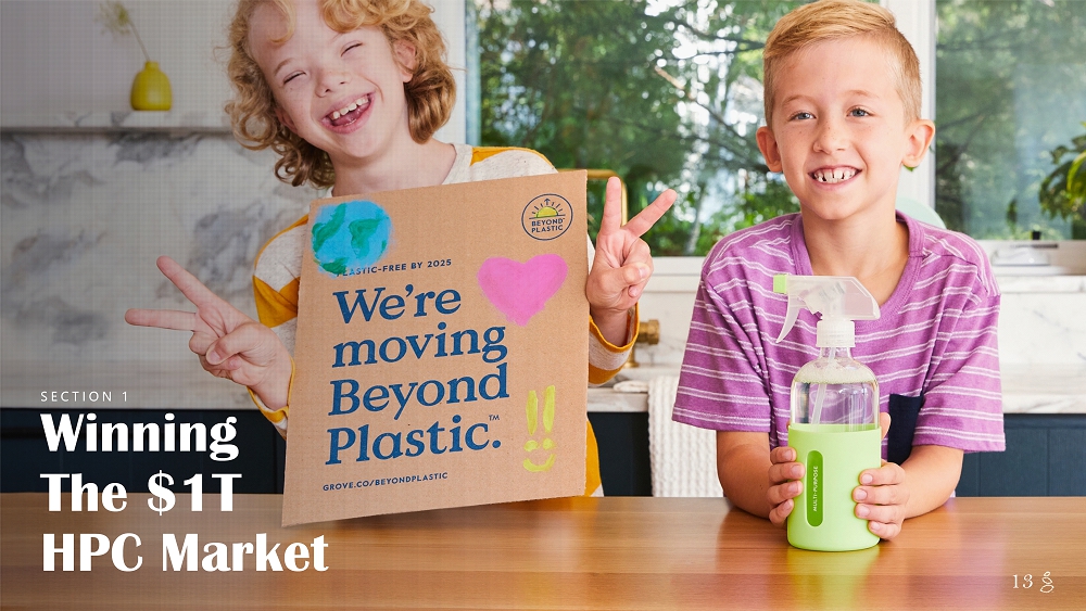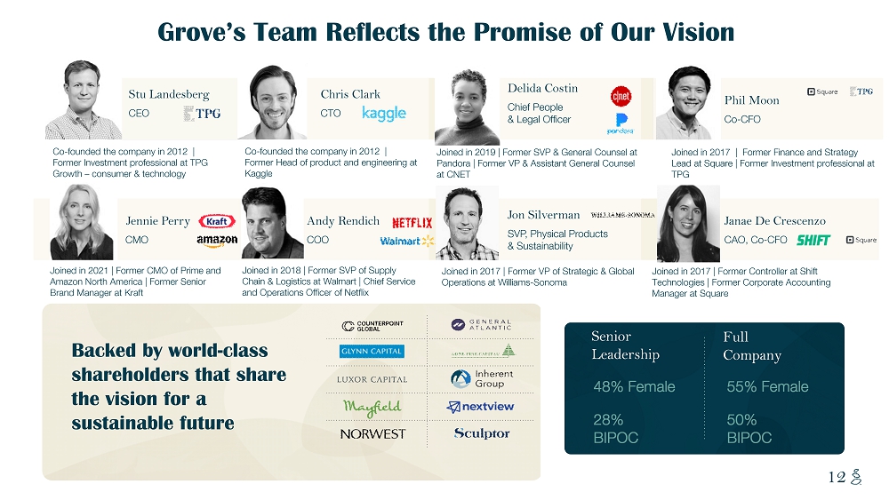 NOTES START FROM HERE AND GROW UP CONTENT BELOW THIS LINE CONTENT BELOW THIS LINE SUBTITLE BELOW THIS LINE TITLE CAN NOT GO ABOVE THIS LINE 12 Stu Landesberg CEO Co - founded the company in 2012 | Former Investment professional at TPG Growth – consumer & technology Chris Clark CTO Co - founded the company in 2012 | Former Head of product and engineering at Kaggle Backed by world - class shareholders that share the vision for a sustainable future 55% Female Senior Leadership Full Company Jennie Perry C MO Joined in 2021 | Former CMO of Prime and Amazon North America | Former Senior Brand Manager at Kraft Andy Rendich C O O Joined in 2018 | Former SVP of Supply Chain & Logistics at Walmart | Chief Service and Operations Officer of Netflix Jon Silverman SVP, Physical Products & Sustainability Joined in 2017 | Former VP of Strategic & Global Operations at Williams - Sonoma 48% Female 50 % BIPOC 28% BIPOC Janae De Crescenzo CAO, Co - CFO Joined in 2017 | Former Controller at Shift Technologies | Former Corporate Accounting Manager at Square Grove’s Team Reflects the Promise of Our Vision Phil Moon Co - CFO Delida Costin Chief People & Legal Officer Joined in 2019 | Former SVP & General Counsel at Pandora | Former VP & Assistant General Counsel at CNET Joined in 2017 | Former Finance and Strategy Lead at Square | Former Investment professional at TPG