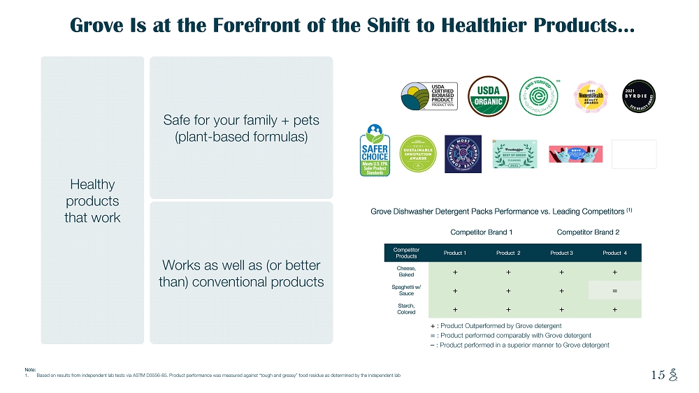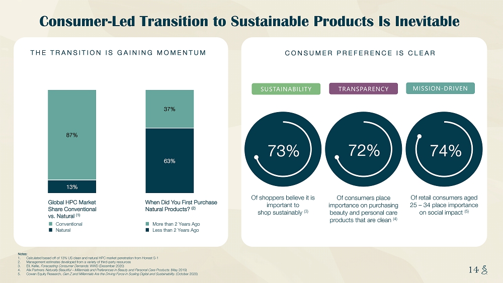 NOTES START FROM HERE AND GROW UP CONTENT BELOW THIS LINE CONTENT BELOW THIS LINE SUBTITLE BELOW THIS LINE TITLE CAN NOT GO ABOVE THIS LINE 14 14 Notes: 1. Calculated based off of 13% US clean and natural HPC market penetration from Honest S - 1 2. Management estimates developed from a variety of third - party resources 3. Ell, Kellie, Forecasting Consumer Demands . WWD (December 2020) 4. Alix Partners Naturally Beautiful – Millennials and Preferences in Beauty and Personal Care Products . (May 2019) 5. Cowen Equity Research, Gen Z and Millennials Are the Driving Force in Scaling Digital and Sustainability. (October 2020) 13% 63% 87% 37% THE TRANSITION IS GAINING MOMENTUM When Did You First Purchase Natural Products? (2) More than 2 Years Ago Less than 2 Years Ago Conventional Natural Global HPC Market Share Conventional vs. Natural (1) Consumer - Led Transition to Sustainable Products Is Inevitable Of retail consumers aged 25 – 34 place importance on social impact (5) Of consumers place importance on purchasing beauty and personal care products that are clean (4) TRANSPARENCY Of shoppers believe it is important to shop sustainably (3) SUSTAINABILITY CONSUMER PREFERENCE IS CLEAR MISSION - DRIVEN 74% 72% 73%