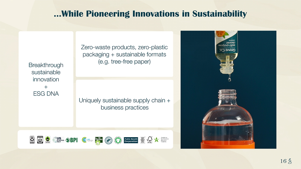 NOTES START FROM HERE AND GROW UP CONTENT BELOW THIS LINE CONTENT BELOW THIS LINE SUBTITLE BELOW THIS LINE TITLE CAN NOT GO ABOVE THIS LINE 16 16 Breakthrough sustainable innovation + ESG DNA Uniquely sustainable supply chain + business practices Zero - waste products, zero - plastic packaging + sustainable formats (e.g. tree - free paper) …While Pioneering Innovations in Sustainability