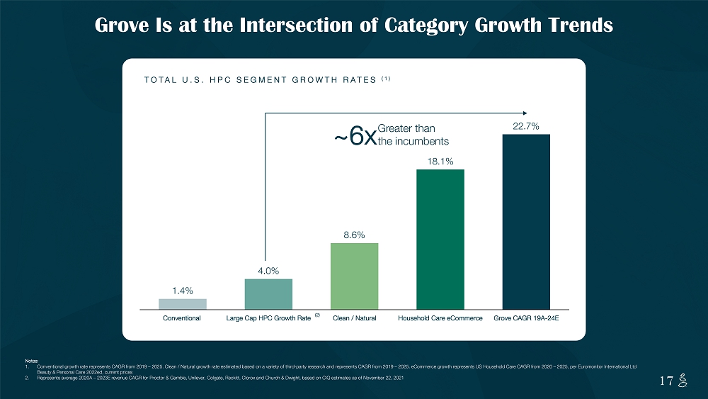 NOTES START FROM HERE AND GROW UP CONTENT BELOW THIS LINE CONTENT BELOW THIS LINE SUBTITLE BELOW THIS LINE TITLE CAN NOT GO ABOVE THIS LINE 17 17 1.4% 4.0% 8.6% 18.1% 22.7% Conventional Large Cap HPC Growth Rate Clean / Natural Household Care eCommerce Grove CAGR 19A-24E Greater than the incumbents ~6x TOTAL U.S. HPC SEGMENT GROWTH RATES (1) Grove Is at the Intersection of Category Growth Trends Notes: 1. Conventional growth rate represents CAGR from 2019 – 2025. Clean / Natural growth rate estimated based on a variety of third - par ty research and represents CAGR from 2019 – 2025. eCommerce growth represents US Household Care CAGR from 2020 – 2025, per Euromonitor International Ltd Beauty & Personal Care 2022ed, current prices 2. Represents average 2020A – 2023E revenue CAGR for Proctor & Gamble, Unilever, Colgate, Reckitt, Clorox and Church & Dwight, base d on CIQ estimates as of November 22, 2021 (2)