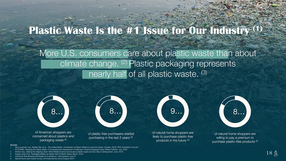 NOTES START FROM HERE AND GROW UP CONTENT BELOW THIS LINE CONTENT BELOW THIS LINE SUBTITLE BELOW THIS LINE TITLE CAN NOT GO ABOVE THIS LINE 18 18 More U.S. consumers care about plastic waste than about climate change. (2) Plastic packaging represents nearly half of all plastic waste. (3) 18 of plastic - free purchasers started purchasing in the last 2 years (5) 8 … of American shoppers are concerned about plastics and packaging waste (4) 8 … of natural home shoppers are willing to pay a premium to purchase plastic - free products (5) 8 … of natural home shoppers are likely to purchase plastic - free products in the future (5) 9 … Plastic Waste Is the #1 Issue for Our Industry (1) Sources: 1. Kara Lavender Law, Natalie Starr et al., The United States’ Contribution of Plastic Waste to Land and Ocean . October, 2020; PEW Charitable Trust and SYSTEMIQ, Breaking the Plastic Wave: A Comprehensive Assessment of Pathways Towards Stopping Ocean Plastic Pollution. July, 2020 2. Shelton Grp, Waking the Sleeping Giant: What Middle America knows about plastic waste and how they’re taking action. June, 2019 3. Supply Chain Dive, Packaging Makes Up Nearly Half Of Plastic Waste . March, 2019 4. Consumer Brands/Ipsos poll based on a sample of 1,530 people in July’21 5. Natural home care market survey commissioned by Grove (August 2021)