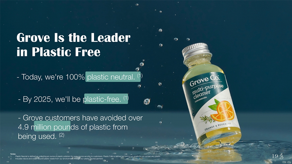 NOTES START FROM HERE AND GROW UP CONTENT BELOW THIS LINE CONTENT BELOW THIS LINE SUBTITLE BELOW THIS LINE TITLE CAN NOT GO ABOVE THIS LINE 19 - Grove customers have avoided over 4.9 million pounds of plastic from being used. (2) - Today, we're 100% plastic neutral. (1) - By 2025, we'll be plastic - free. (1) Grove Is the Leader in Plastic Free 19 Notes: 1. Plastic Neutral is defined as collecting an ounce of plastic pollution for every ounce we ship to customers; Plastic Free is def ined as having out products not contain any plastic 2. Includes nature and ocean - bound plastic waste from our environment through our plastic neutral partners