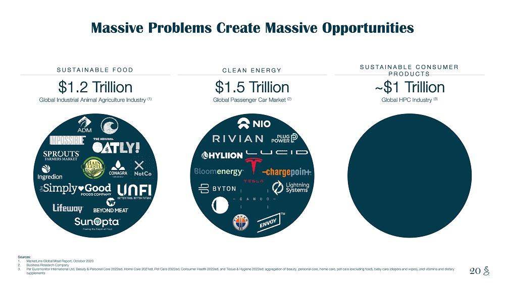 NOTES START FROM HERE AND GROW UP CONTENT BELOW THIS LINE CONTENT BELOW THIS LINE SUBTITLE BELOW THIS LINE TITLE CAN NOT GO ABOVE THIS LINE 20 Massive Problems Create Massive Opportunities Sources: 1. MarketLine Global Meat Report, October 2020 2. Business Research Company 3. Per Euromonitor International Ltd, Beauty & Personal Care 2022ed, Home Care 2021ed, Pet Care 2022ed, Consumer Health 2022ed, and Tissue & Hyg ie ne 2022ed; aggregation of beauty, personal care, home care, pet care (excluding food), baby care (diapers and wipes), and vit ami ns and dietary supplements $1.2 Trillion Global Industrial Animal Agriculture Industry (1) SUSTAINABLE FOOD $1.5 Trillion Global Passenger Car Market (2) CLEAN ENERGY ~$1 Trillion Global HPC Industry ( 3 ) SUSTAINABLE CONSUMER PRODUCTS