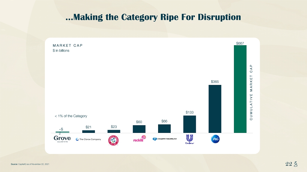 NOTES START FROM HERE AND GROW UP CONTENT BELOW THIS LINE CONTENT BELOW THIS LINE SUBTITLE BELOW THIS LINE TITLE CAN NOT GO ABOVE THIS LINE 21 Legacy Players Have Not Innovated Leading Natural Brands… SELECT NATURAL HPC M&A ACQ. ACQ. ACQ. ACQ. ACQ. THERE IS ONE INDEPENDENT, PURE PLAY, $100MM+ REVENUE HOME CARE BRAND FOCUSED ON HEALTH + SUSTAINABILITY