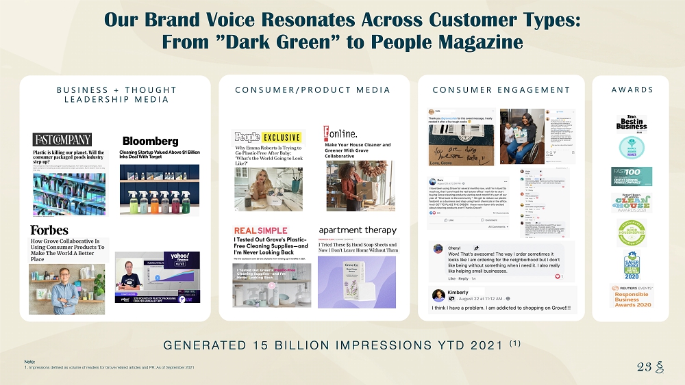 NOTES START FROM HERE AND GROW UP CONTENT BELOW THIS LINE CONTENT BELOW THIS LINE SUBTITLE BELOW THIS LINE TITLE CAN NOT GO ABOVE THIS LINE 23 23 Our Brand Voice Resonates Across Customer Types: From ”Dark Green” to People Magazine Note: 1. Impressions defined as volume of readers for Grove related articles and PR; As of September 2021 CONSUMER ENGAGEMENT AWARDS BUSINESS + THOUGHT LEADERSHIP MEDIA CONSUMER/PRODUCT MEDIA GENERATED 15 BILLION IMPRESSIONS YTD 2021 (1)