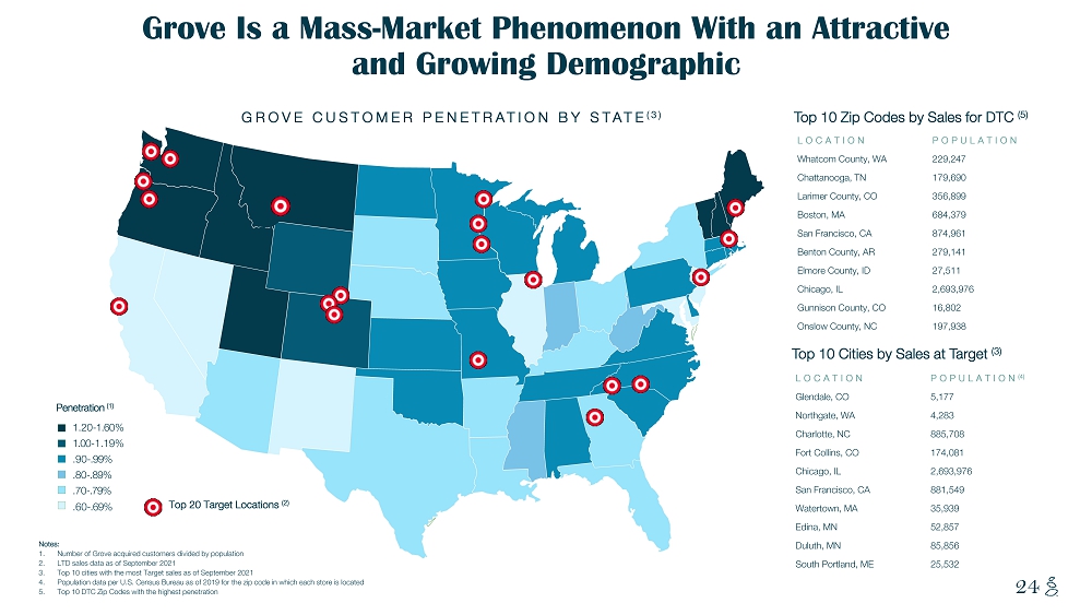 NOTES START FROM HERE AND GROW UP CONTENT BELOW THIS LINE CONTENT BELOW THIS LINE SUBTITLE BELOW THIS LINE TITLE CAN NOT GO ABOVE THIS LINE 24 Grove Is a Mass - Market Phenomenon With an Attractive and Growing Demographic Penetration (1) .60 - .69% .70 - .79% .80 - .89% .90 - .99% 1.00 - 1.19% 1.20 - 1.60 % Top 20 Target Locations (2) Notes: 1. Number of Grove acquired customers divided by population 2. LTD sales data as of September 2021 3. Top 10 cities with the most Target sales as of September 2021 4. Population data per U.S. Census Bureau as of 2019 for the zip code in which each store is located 5. Top 10 DTC Zip Codes with the highest penetration LOCATION POPULATION (4) Glendale, CO 5,177 Northgate, WA 4,283 Charlotte, NC 885,708 Fort Collins, CO 174,081 Chicago, IL 2,693,976 San Francisco, CA 881,549 Watertown, MA 35,939 Edina, MN 52,857 Duluth, MN 85,856 South Portland, ME 25,532 LOCATION POPULATION Whatcom County, WA 229,247 Chattanooga, TN 179,690 Larimer County, CO 356,899 Boston, MA 684,379 San Francisco, CA 874,961 Benton County, AR 279,141 Elmore County, ID 27,511 Chicago, IL 2,693,976 Gunnison County, CO 16,802 Onslow County, NC 197,938 Top 10 Zip Codes by Sales for DTC (5) Top 10 Cities by Sales at Target (3) GROVE CUSTOMER PENETRATION BY STATE (3)
