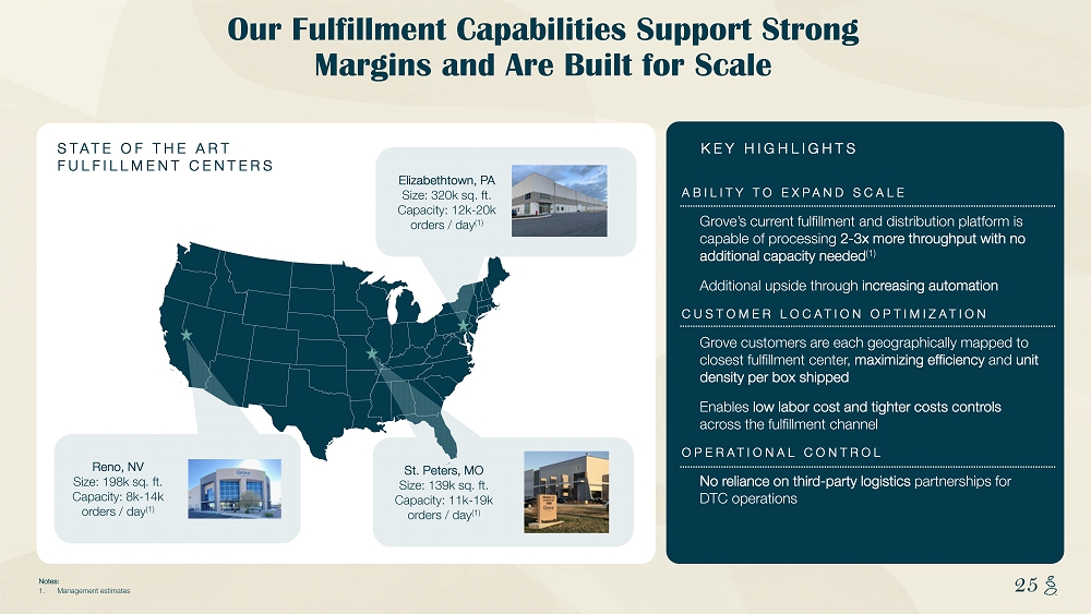 NOTES START FROM HERE AND GROW UP CONTENT BELOW THIS LINE CONTENT BELOW THIS LINE SUBTITLE BELOW THIS LINE TITLE CAN NOT GO ABOVE THIS LINE 25 25 ABILITY TO EXPAND SCALE Grove’s current fulfillment and distribution platform is capable of processing 2 - 3x more throughput with no additional capacity needed (1) Additional upside through increasing automation CUSTOMER LOCATION OPTIMIZATION Grove customers are each geographically mapped to closest fulfillment center, maximizing efficiency and unit density per box shipped Enables low labor cost and tighter costs controls across the fulfillment channel OPERATIONAL CONTROL No reliance on third - party logistics partnerships for DTC operations Our Fulfillment Capabilities Support Strong Margins and Are Built for Scale St. Peters, MO Size: 139k sq. ft. Capacity: 11k - 19k orders / day (1) Elizabethtown, PA Size: 320k sq. ft. Capacity: 12k - 20k orders / day (1) Reno, NV Size: 198k sq. ft. Capacity: 8k - 14k orders / day (1) KEY HIGHLIGHTS STATE OF THE ART FULFILLMENT CENTERS Notes: 1. Management estimates