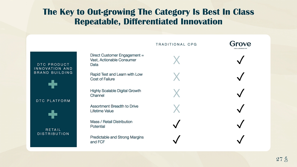 NOTES START FROM HERE AND GROW UP CONTENT BELOW THIS LINE CONTENT BELOW THIS LINE SUBTITLE BELOW THIS LINE TITLE CAN NOT GO ABOVE THIS LINE 27 27 TRADITIONAL CPG DTC PRODUCT INNOVATION AND BRAND BUILDING Direct Customer Engagement = Vast, Actionable Consumer Data X ✓ Rapid Test and Learn with Low Cost of Failure X ✓ DTC PLATFORM Highly Scalable Digital Growth Channel X ✓ Assortment Breadth to Drive Lifetime Value X ✓ RETAIL DISTRIBUTION Mass / Retail Distribution Potential ✓ ✓ Predictable and S trong Margins and FCF ✓ ✓ The Key to Out - growing The Category Is Best In Class Repeatable, Differentiated Innovation