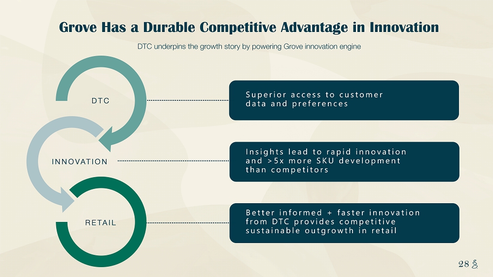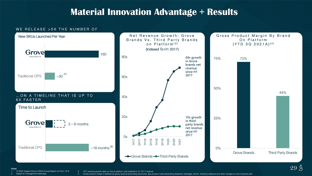 NOTES START FROM HERE AND GROW UP CONTENT BELOW THIS LINE CONTENT BELOW THIS LINE SUBTITLE BELOW THIS LINE TITLE CAN NOT GO ABOVE THIS LINE 28 28 Superior access to customer data and preferences Insights lead to rapid innovation and > 5x more SKU development than competitors Better informed + faster innovation from DTC provides competitive sustainable outgrowth in retail DTC underpins the growth story by powering Grove innovation engine Grove Has a Durable Competitive Advantage in Innovation DTC INNOVATION RETAIL