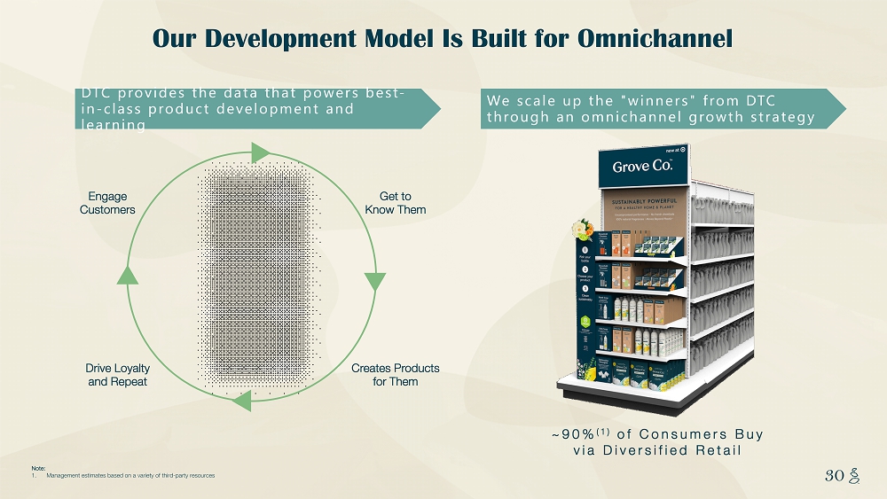 NOTES START FROM HERE AND GROW UP CONTENT BELOW THIS LINE CONTENT BELOW THIS LINE SUBTITLE BELOW THIS LINE TITLE CAN NOT GO ABOVE THIS LINE 30 30 Note: 1. Management estimates based on a variety of third - party resources Engage Customers Get to Know Them Creates Products for Them Drive Loyalty and Repeat We scale up the "winners" from DTC through an omnichannel growth strategy DTC provides the data that powers best - in - class product development and learning Our Development Model Is Built for Omnichannel ~90% (1) of Consumers Buy via Diversified Retail