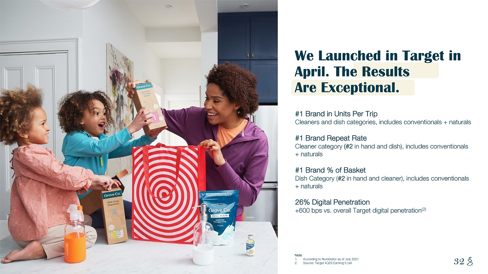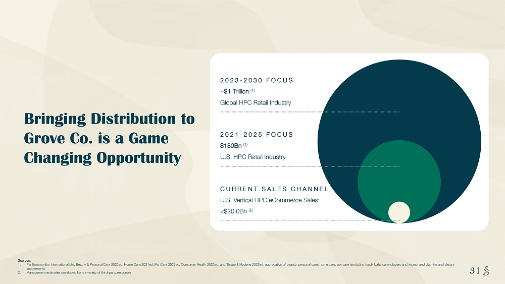 NOTES START FROM HERE AND GROW UP CONTENT BELOW THIS LINE CONTENT BELOW THIS LINE SUBTITLE BELOW THIS LINE TITLE CAN NOT GO ABOVE THIS LINE 31 31 Bringing Distribution to Grove Co. is a Game Changing Opportunity Sources: 1. Per Euromonitor International Ltd, Beauty & Personal Care 2022ed, Home Care 2021ed, Pet Care 2022ed, Consumer Health 2022ed, and Tissue & Hyg ie ne 2022ed; aggregation of beauty, personal care, home care, pet care (excluding food), baby care (diapers and wipes), and vit ami ns and dietary supplements 2. Management estimates developed from a variety of third - party resources CURRENT SALES CHANNEL U.S. Vertical HPC eCommerce Sales: <$20.0Bn (2) 2021 - 2025 FOCUS $180Bn (1) U.S. HPC Retail Industry 2023 - 2030 FOCUS ~$1 Trillion (1) Global HPC Retail Industry