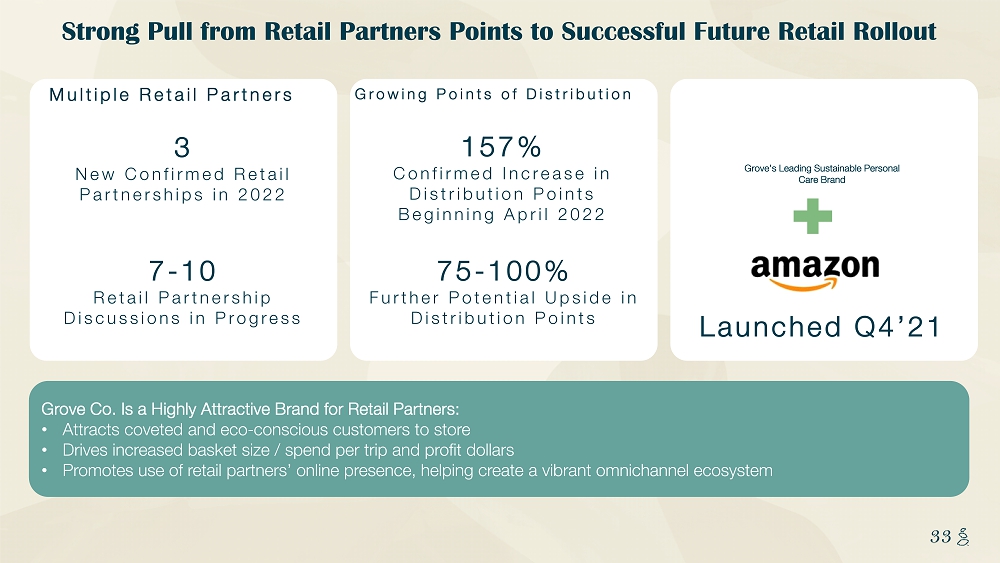 NOTES START FROM HERE AND GROW UP CONTENT BELOW THIS LINE CONTENT BELOW THIS LINE SUBTITLE BELOW THIS LINE TITLE CAN NOT GO ABOVE THIS LINE 33 33 Strong Pull from Retail Partners Points to Successful Future Retail Rollout Grove Co. Is a Highly Attractive Brand for Retail Partners: • Attracts coveted and eco - conscious customers to store • Drives increased basket size / spend per trip and profit dollars • Promotes use of retail partners’ online presence, helping create a vibrant omnichannel ecosystem Multiple Retail Partners 3 New Confirmed Retail Partnerships in 2022 7 - 10 Retail Partnership Discussions in Progress Growing Points of Distribution 157% Confirmed Increase in Distribution Points Beginning April 2022 75 - 100% Further Potential Upside in Distribution Points Launched Q4’21 Grove’s Leading Sustainable Personal Care Brand