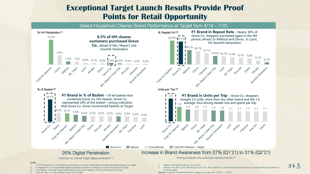 NOTES START FROM HERE AND GROW UP CONTENT BELOW THIS LINE CONTENT BELOW THIS LINE SUBTITLE BELOW THIS LINE TITLE CAN NOT GO ABOVE THIS LINE 34 34 Exceptional Target Launch Results Provide Proof Points for Retail Opportunity Notes: 1. % HH Penetration: % of households purchasing out of total households purchasing Household Cleaners at Target 2. % Repeat HH: % of households repeat purchasing the brand or category in a given time period at Target 3. % of Basket: % of total Target basket made up of a given category or brand at checkout at Target 4. Units Per Trip: # of units bought in each trip to Target 5. Based on Numerator data as of July 2021 6. Online survey from June 18th through June 27th, 2021 based on 1,023 natural shoppers that have purchased natural and intend t o purchase again Source: Numerator Household Cleaners Category at Target from 4/18/21 – 7/25/21 12.4% 4.6% 1.5% 1.5% 0.9% 0.7% 0.6% 0.5% 0.5% 0.4% 0.3% 0.2% % HH Penetration (1) % Repeat HH (2) % of Basket (3) Units per Trip (4) 29.9% 28.7% 18.1% 16.7% 14.1% 10.6% 10.1% 9.4% 8.1% 7.6% 5.1% 2.7% 2.5 1.6 1.3 1.3 1.3 1.2 1.2 1.1 1.1 1.1 1.1 1.1 24.2% 9.5% 9.1% 7.6% 6.5% 6.3% 6.3% 6.2% 5.9% 5.9% 5.2% 4.5% Grove Co. Natural Conventional Total HH Cleaners - Target Select Household Cleaner Brand Performance at Target from 4/18 – 7/25 0.5% of HH cleaner customers purchased Grove Co. , ahead of Mrs. Meyer’s and Seventh Generation #1 Brand in Repeat Rate – Nearly 30% of Grove Co. shoppers purchased again in the 3M period, almost 2x Method and Clorox, 3x Lysol, 14x Seventh Generation #1 Brand in % of Basket – Of all baskets that contained Grove Co. HH cleaner, Grove Co. represented 24% of the basket – strong indication that Grove Co. drives incremental baskets at Target #1 Brand in Units per Trip – Grove Co. shoppers bought 2.5 units, more than any other brand and the 1.6 average, thus driving basket size and spend per trip 26% Digital Penetration +600 bps vs. Overall Target digital penetration (5) Increase in Brand Awareness from 27% (Q1’21) to 31% (Q2’21) Among shoppers who purchase natural products (6)
