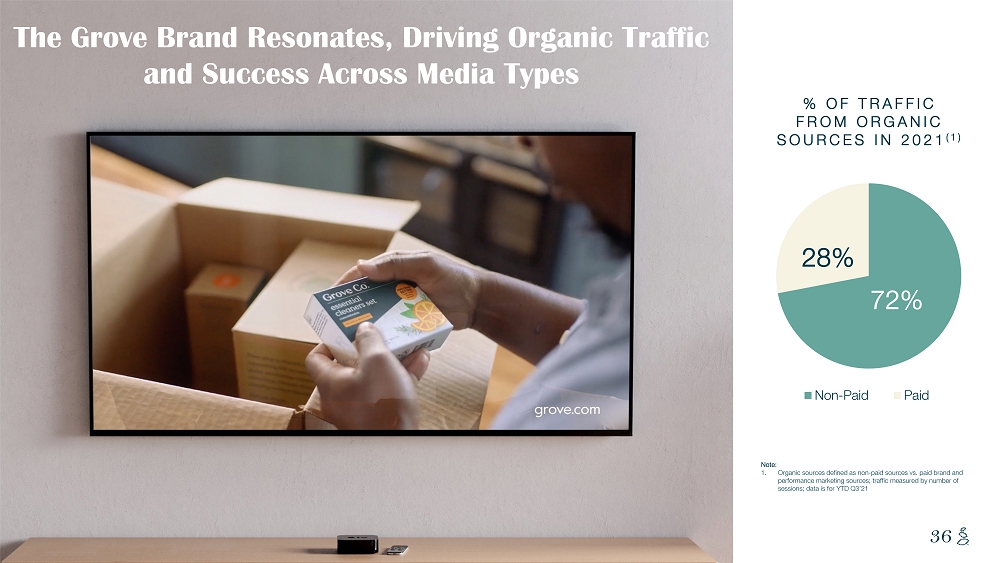 NOTES START FROM HERE AND GROW UP CONTENT BELOW THIS LINE CONTENT BELOW THIS LINE SUBTITLE BELOW THIS LINE TITLE CAN NOT GO ABOVE THIS LINE 36 36 % OF TRAFFIC FROM ORGANIC SOURCES IN 2021 (1) 72% 28% Non-Paid Paid The Grove Brand Resonates, Driving Organic Traffic and Success Across Media Types 36 36 Note: 1. Organic sources defined as non - paid sources vs. paid brand and performance marketing sources; traffic measured by number of sessions; data is for YTD Q3’21