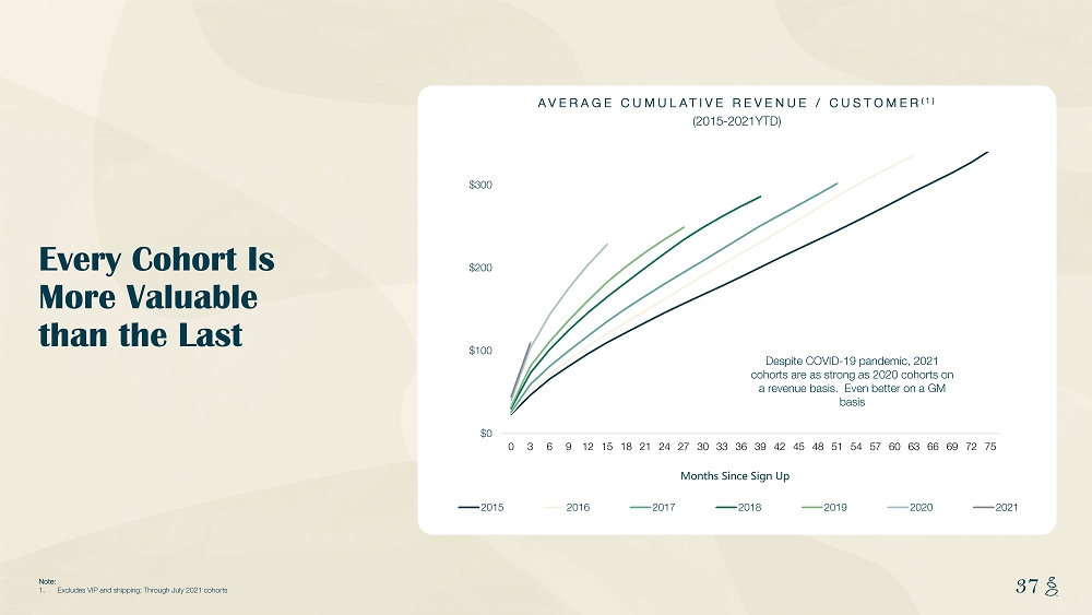 NOTES START FROM HERE AND GROW UP CONTENT BELOW THIS LINE CONTENT BELOW THIS LINE SUBTITLE BELOW THIS LINE TITLE CAN NOT GO ABOVE THIS LINE 37 37 Note: 1. Excludes VIP and shipping; Through July 2021 cohorts $0 $100 $200 $300 0 3 6 9 12 15 18 21 24 27 30 33 36 39 42 45 48 51 54 57 60 63 66 69 72 75 2015 2016 2017 2018 2019 2020 2021 AVERAGE CUMULATIVE REVENUE / CUSTOMER (1) (2015 - 2021YTD) Despite COVID - 19 pandemic, 2021 cohorts are as strong as 2020 cohorts on a revenue basis. Even better on a GM basis Months Since Sign Up Every Cohort Is More Valuable than the Last MS - Stretch the chart vertically