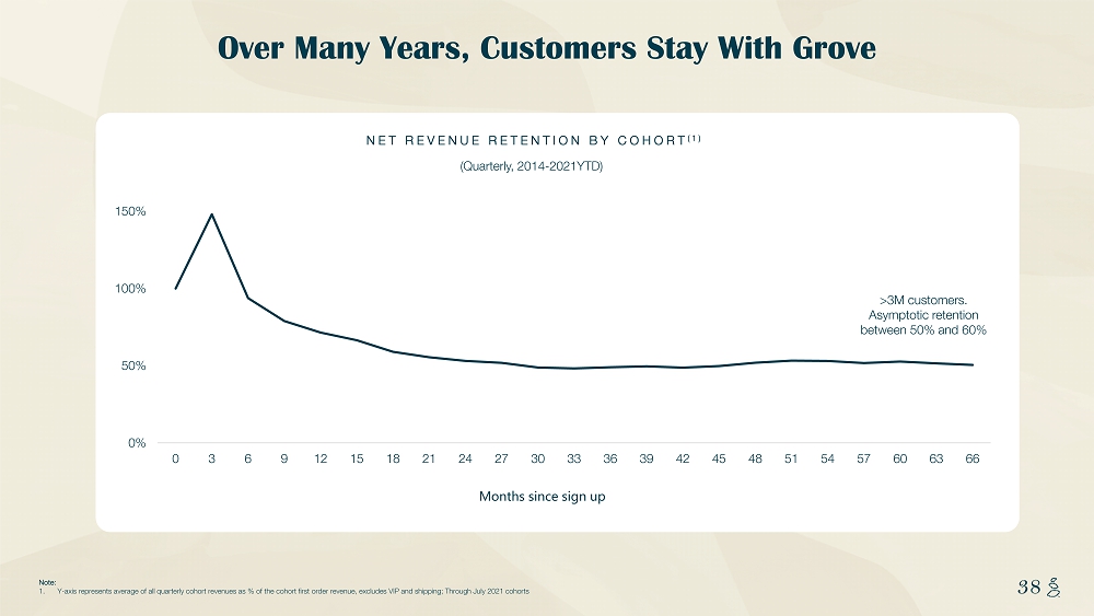 NOTES START FROM HERE AND GROW UP CONTENT BELOW THIS LINE CONTENT BELOW THIS LINE SUBTITLE BELOW THIS LINE TITLE CAN NOT GO ABOVE THIS LINE 38 38 0% 50% 100% 150% 0 3 6 9 12 15 18 21 24 27 30 33 36 39 42 45 48 51 54 57 60 63 66 Months since sign up Note: 1. Y - axis represents average of all quarterly cohort revenues as % of the cohort first order revenue, excludes VIP and shipping; T h rough July 2021 cohorts NET REVENUE RETENTION BY COHORT (1) (Quarterly, 2014 - 2021YTD) Over Many Years, Customers Stay With Grove > 3 M customers. Asymptotic retention between 50% and 60%