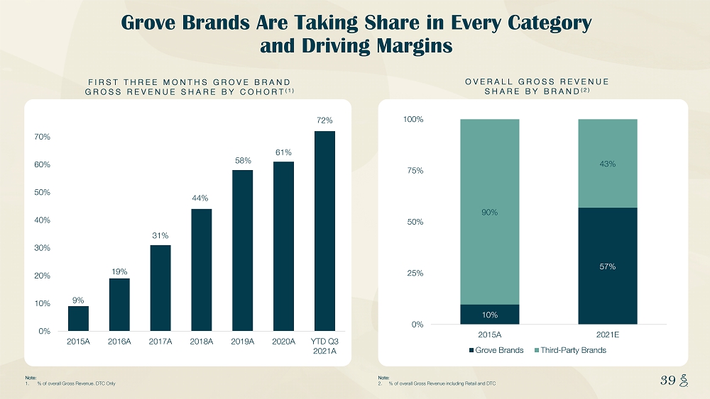 NOTES START FROM HERE AND GROW UP CONTENT BELOW THIS LINE CONTENT BELOW THIS LINE SUBTITLE BELOW THIS LINE TITLE CAN NOT GO ABOVE THIS LINE 39 39 Note: 1. % of overall Gross Revenue. DTC Only FIRST THREE MONTHS GROVE BRAND GROSS REVENUE SHARE BY COHORT (1 ) 9% 19% 31% 44% 58% 61% 72% 0% 10% 20% 30% 40% 50% 60% 70% 2015A 2016A 2017A 2018A 2019A 2020A YTD Q3 2021A Grove Brands Are Taking Share in Every Category and Driving Margins OVERALL GROSS REVENUE SHARE BY BRAND (2 ) 10% 57% 90% 43% 0% 25% 50% 75% 100% 2015A 2021E Grove Brands Third-Party Brands Note: 2. % of overall Gross Revenue including Retail and DTC